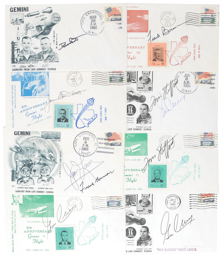 Collection of eight covers with cachets honoring various Gemini missions, each signed in felt tip or ballpoint by one or more astronauts, including: Gene Cernan and Tom Stafford; James Lovell and Frank Borman; Dave Scott; James McDivitt; Frank Borman; Gene Cernan (2); and Tom Stafford. In overall fine condition.