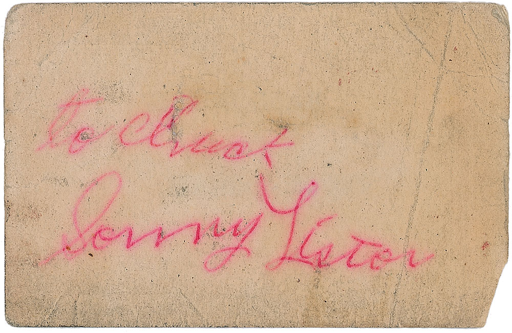 Very scarce red ink signature and inscription, “To Chuck, Sonny Liston,” on an off-white 3 x 2 slip. In very good condition, with moderate to heavy overall creases and soiling, and haloing to ink. Pre-certified Steve Grad/PSA/DNA and RR Auction COA.