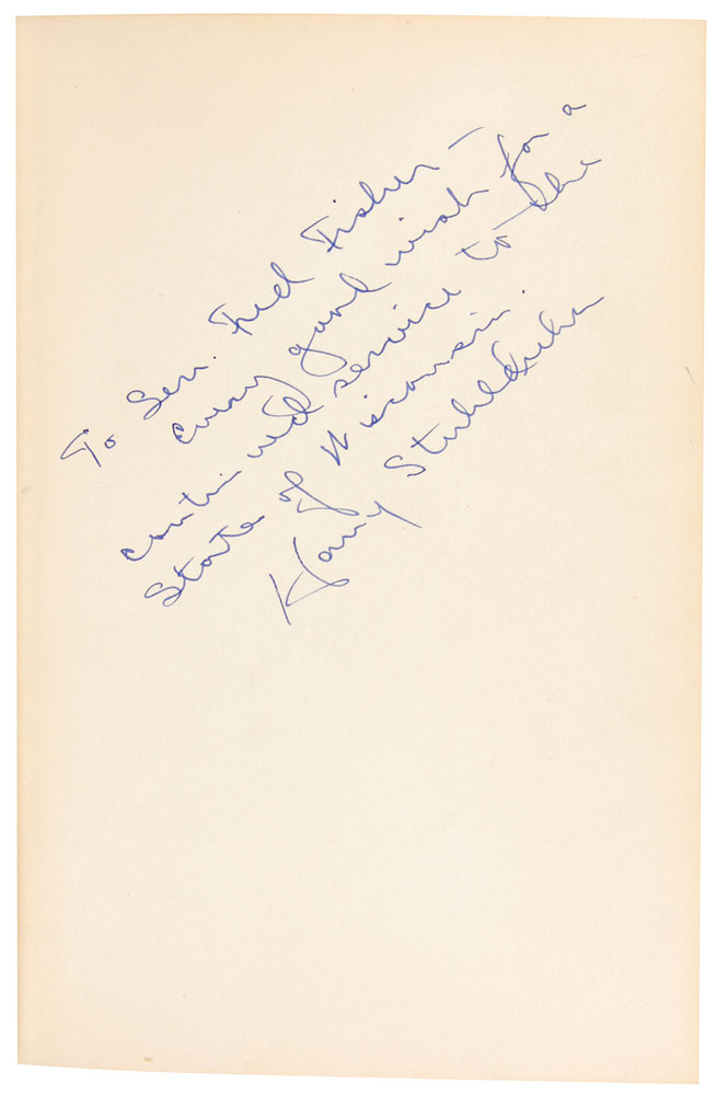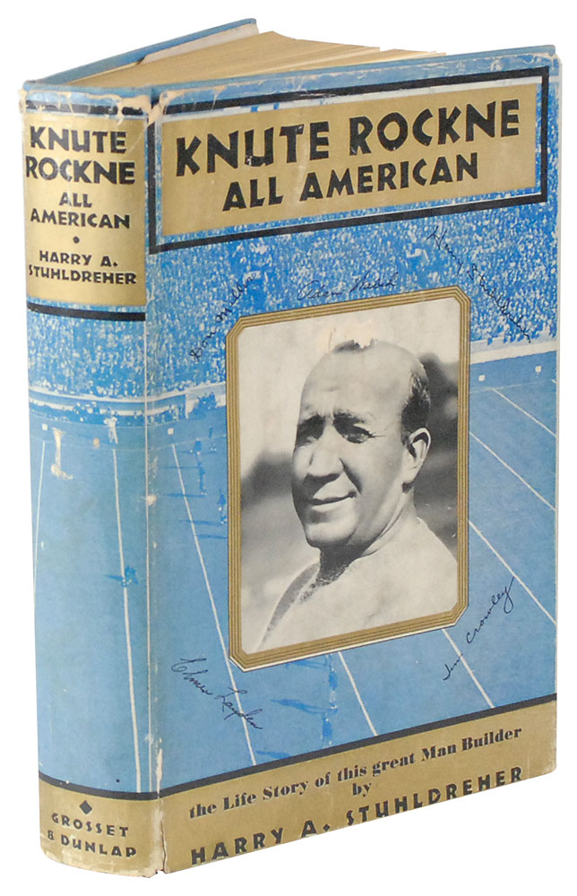 Signed book: Knute Rockne: All American. NY: Grosset & Dunlap, 1931. Hardcover with dust jacket, 5.75 x 8.25, 335 pages. Signed and inscribed on the first free end page in blue ballpoint, “To Sen. Fred Fisher—Every good wish for a continued service to the state of Wisconsin, Harry Stuhldreher.” In fine condition, with a few trivial chips to dust jacket edges. Pre-certified Steve Grad/PSA/DNA and RR Auction COA.