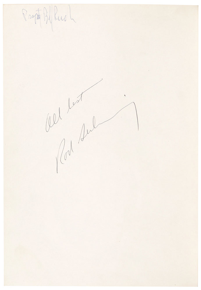 Signed book: The Twilight Zone. NY: Grosset & Dunlap, 1961. Hardcover with dust jacket, 7.25 x 10.25, 207 pages. Signed on the reverse of the first free end page in black ballpoint, “All best, Rod Serling.” An ownership signature at the top of the signed page and a few small edge tears to dust jacket, otherwise fine condition. Pre-certified PSA/DNA and RR Auction COA.