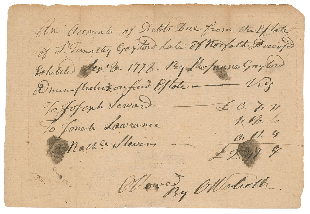 Connecticut politician (1726–1797) who signed both the Declaration of Independence and Articles of Confederation, and later served as governor of the state. Revolutionary War–dated manuscript DS, signed “O. Wolcott,” one page, 7.25 x 5, September 8, 1778. Financial document listing “accounts of debts due from the Estate of S. Timothy Gaylord,” amounting to a total of £2.17.7. Intersecting folds, mild toning, and several stray ink blots, otherwise fine condition. Pre-certified John Reznikoff/PSA/DNA and RR Auction COA.