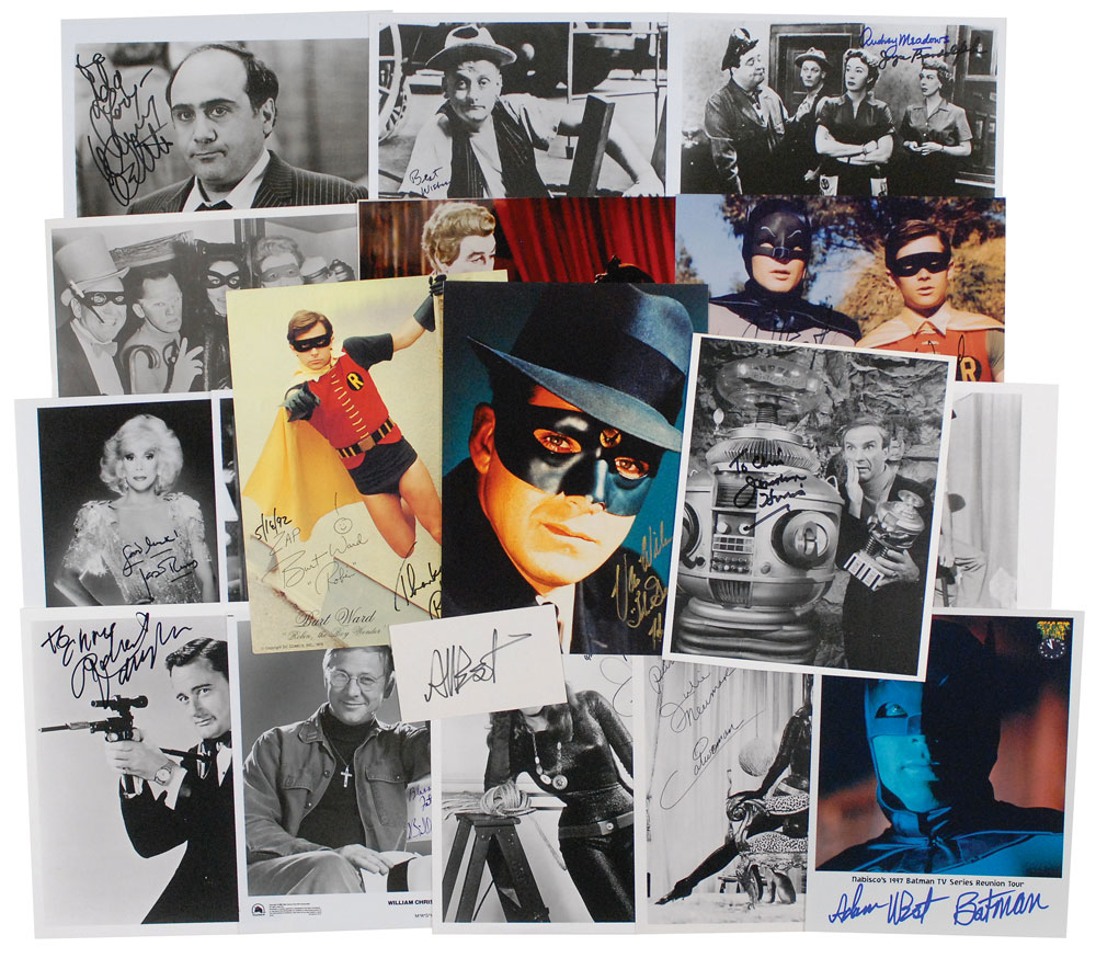Collection of one signed 3 x 5 card and 19 signed photos, each signed by the television star pictured. Included are several Batman-related photos, signed individually by Adam West, Burt Ward, Van Williams, Julie Newmar (2), and Caesar Romero (2), plus one photo signed by both West and Ward, and one 3 x 5 card signed by West. Remaining SPs include: The Honeymooners (Art Carney, Joyce Randolph, and Audrey Meadows); Art Carney; Joan Rivers; Vanna White; Danny DeVito; William Christopher; Paul Petersen (2); Mike Farrell; Jonathan Harris; and Robert Vaughn. In overall fine condition. RR Auction COA.
