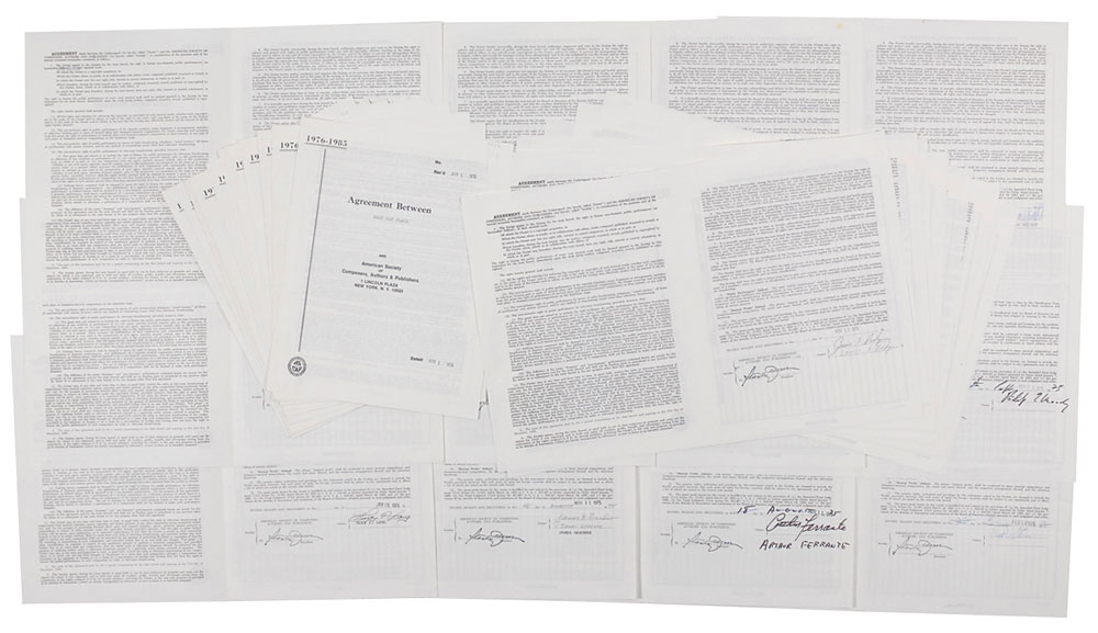 Collection of approximately 34 contracts from the American Society of Composers, Authors and Publishers, signed by the following: Max Stein, Arthur Ferrante, James Gardner, Huey Long, Philip Moody, Alfred John Neumann, Gil Scott-Heron, Robert Young, Gary Malcolm Wright, Mary Rivers, Thomas Paxton, Joseph Pasternak, Mary Kay Place, Gordon Parks, Hermes Pan, Ted Nichols, Lorenzo Music, Andrea Marcovicci, Steve Lawrence, Audrey Landers, Arthur Godfrey, Dick Gautier, Jim Stafford, Barrie Stavis, Melvin Van Peebles, Earl Wilson (2), Glen Yarbrough, Arne Sultan, Enzo Stuarti, James O. Rodgers III, James Frederick Rodgers, Al Sherman, and Rod McKuen. In overall fine condition. RR Auction COA.