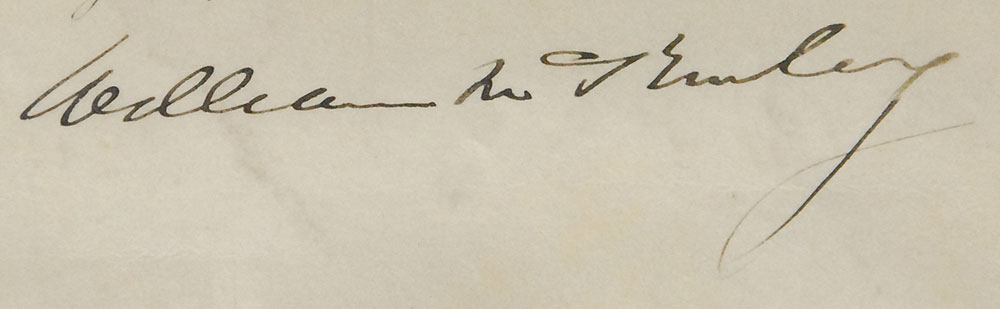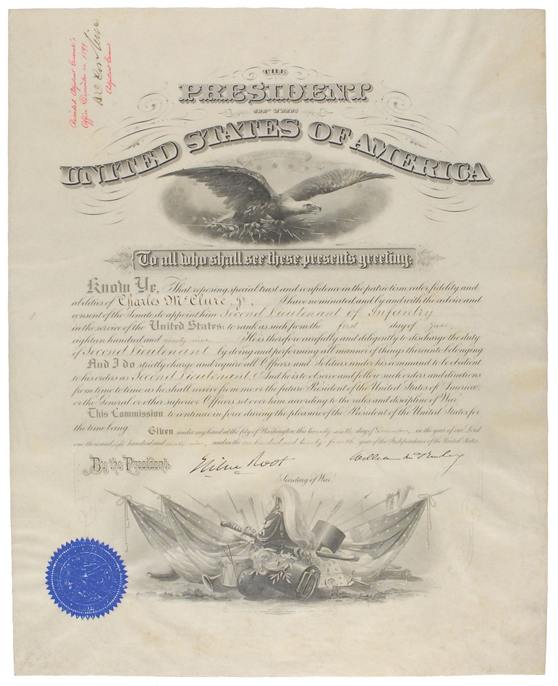 Partly-printed vellum DS as president, one page, 15.75 x 19.5, December 26, 1899. President McKinley appoints Charles McClure, Jr., as “Second Lieutenant of Infantry in the service of the United States.” Boldly signed at the conclusion by President McKinley and Secretary of War Elihu Root. The blue seal affixed to the lower left remains intact with light rubbing. In fine condition. An especially attractive example. Pre-certified John Reznikoff/PSA/DNA and RR Auction COA.