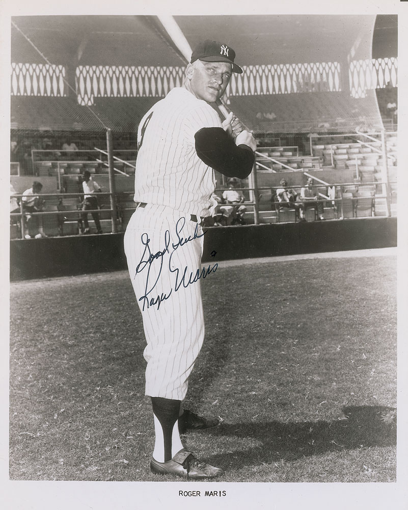 Vintage circa 1960s glossy 8 x 10 photo of Maris posing in his batting stance, signed in fountain pen, “Good Luck, Roger Maris.” Scattered bends and creases, otherwise fine condition. Maris is generally uncommon, particularly from this period. Pre-certified Steve Grad/PSA/DNA and RR Auction COA.