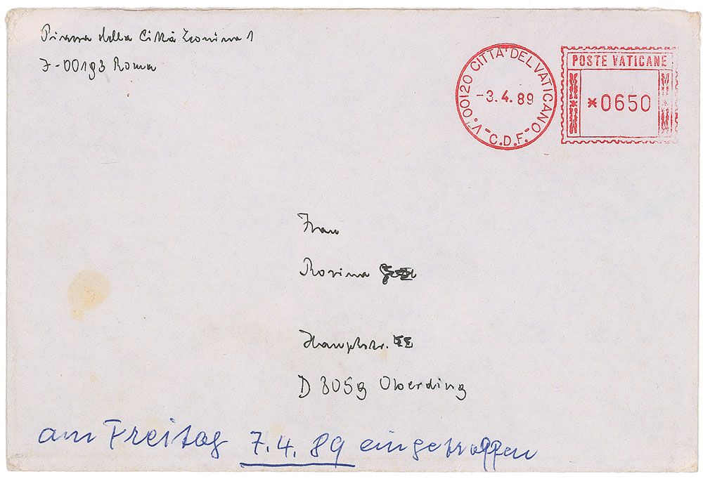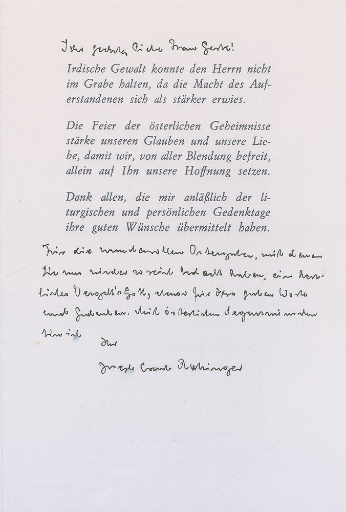 ALS in German, signed “Joseph Card. Ratzinger,” one page inside an Easter greeting card, 4.5 x 6.75, no date but postmarked April 3, 1989. In full (translated): “Thank you for your wonderful Easter presents, which you have given to us again, a warm, heavenly thank you, as well as for your good words and thoughts. With Easterly blessings.” In fine condition, with a trivial brush to the signature. Accompanied by the original mailing envelope, addressed in his own hand. Pre-certified PSA/DNA and RR Auction COA.