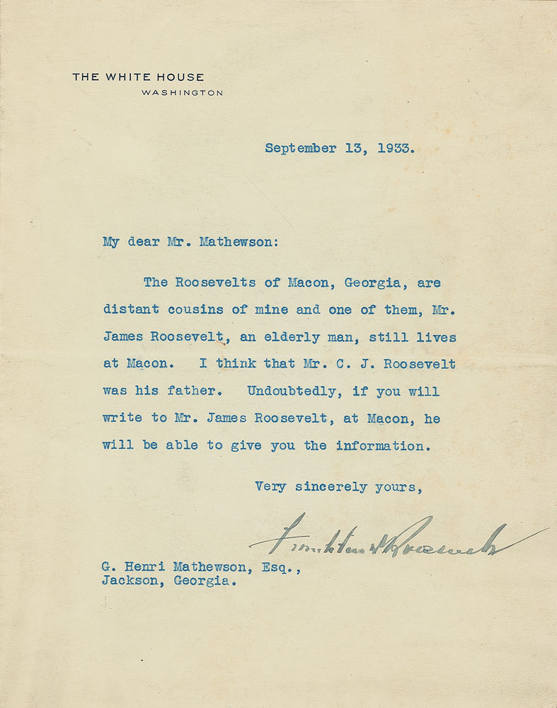 TLS as president, one page, 7 x 8.75, White House letterhead, September 13, 1933. Letter to G. Henri Mathewson of Jackson, Georgia. In full: “The Roosevelts of Macon, Georgia, are distant cousins of mine and one of them, Mr. James Roosevelt, still lives at Macon. I think that Mr. C. J. Roosevelt was his father. Undoubtedly, if you will write to Mr. James Roosevelt, at Macon, he will be able to give you the information.” Mild foxing and overall creases (a diagonal crease passing through the bottom portion), otherwise fine condition. Desirable genealogical content regarding one of the oldest and most influential political families in American history. Pre-certified John Reznikoff/PSA/DNA and RR Auction COA.