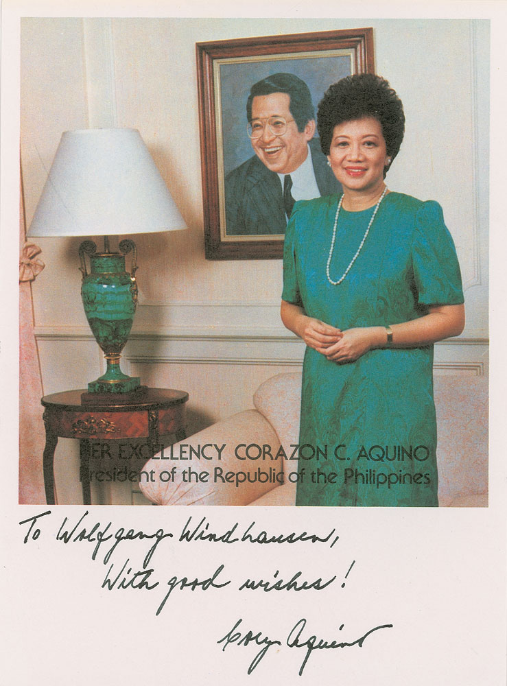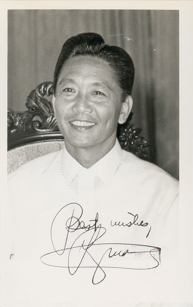 Collection of five photos of Filipino leaders, measuring 4 x 5 to 5 x 8, each signed in ink by the leader pictured, many inscribed, including: Carlos P. Garcia (president from 1957 to 1961), Diosdado Macapagal (president from 1961 to 1965), Ferdinand Marcos (president from 1965 to 1986), Corazon Aquino (president from 1986 to 1992), and Carlos P. Romulo (writer and longtime secretary of foreign affairs). Some light brushing to signatures and a noticeable crease to the Romulo photo, otherwise overall fine condition. Pre-certified PSA/DNA.