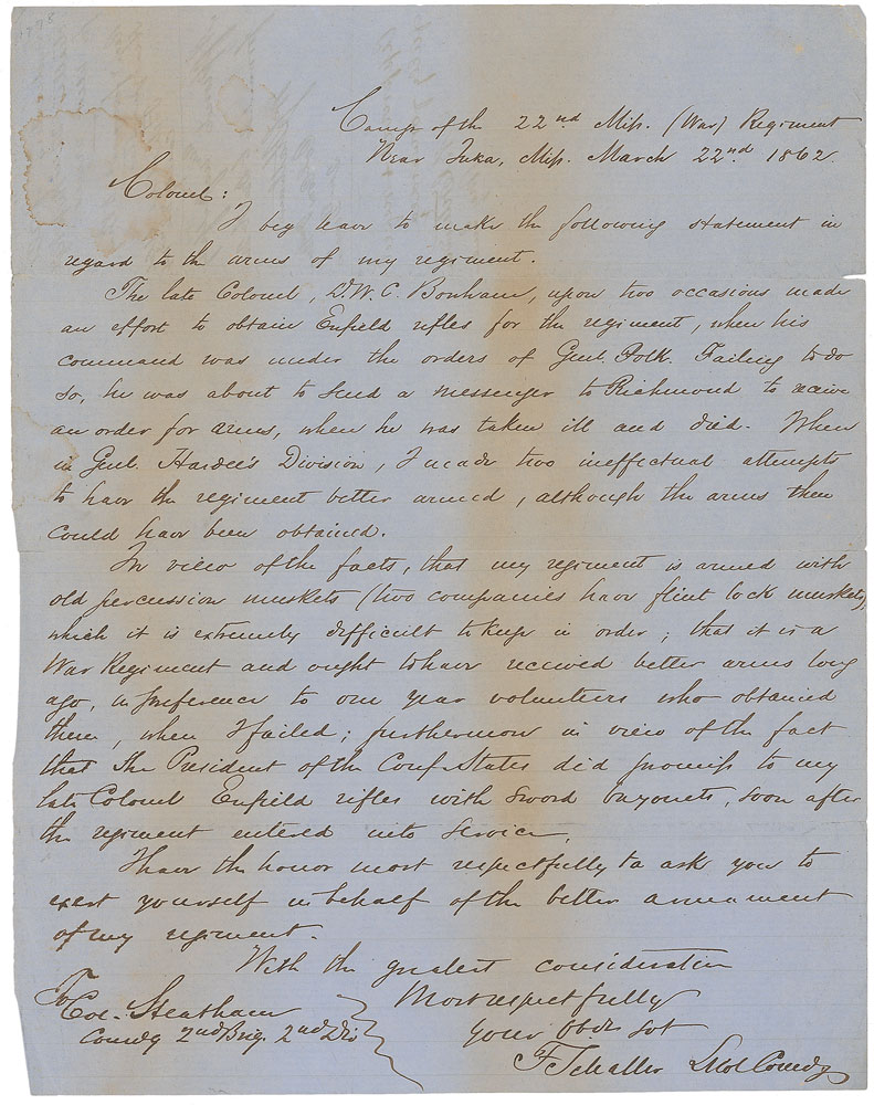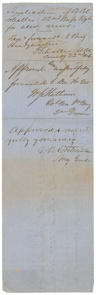 Confederate general (1812–1880) who was defeated at the Battle of Mill Springs on January 18, 1862, the first important Confederate defeat of the war. Civil War–dated handwritten endorsement, “Approved & respectfully forwarded, G. B. Crittenden, Maj Genl,” penned on the reverse docketing panel of an ALS signed “F. Schaller, Lt Col Comdg,” one page, 8.25 x 10.5, March 22, 1862. Schaller’s letter, sent to Colonel Stathem, requests more modern arms. In part: “The late Colonel, D. W. C. Bonhauer, upon two occasions made an effort to obtain Enfield rifles for the regiment…When in Gen. Hardee’s Division, I made two ineffectual attempts to have the regiment better armed, although the arms then could have been obtained. In view of the fact that my regiment is armed with old percussion muskets (two companies have flint-lock muskets), which it is extremely difficult to keep in order…furthermore, in view of the fact that the President of the Conf. States did promise to my late Colonel Enfield rifles with sword bayonets…I have the honor most respectfully to ask you to exert yourself on behalf of the better armament of my regiment.” In very good condition, with a few tiny edge tears, a few spots of dampstaining, and two large bands of toning. Pre-certified PSA/DNA.