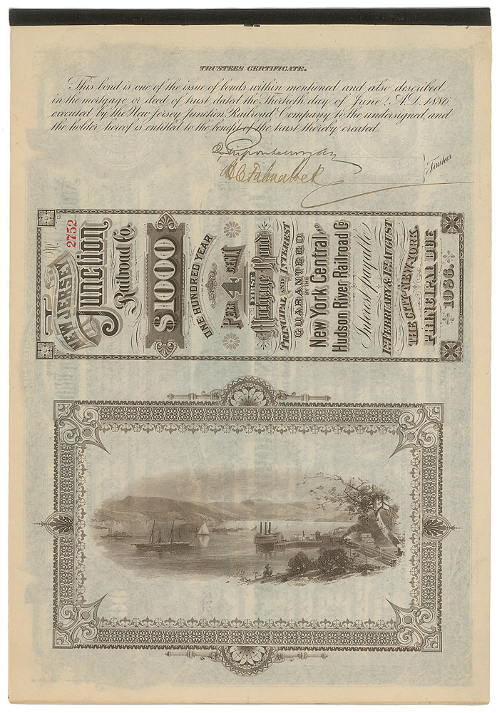 Handsome DS, one page both sides, 9.5 x 13.5, June 30, 1886. A one-hundred year bond issued by the New Jersey Junction Railroad Company for $1000, signed at the top by Morgan and Harris C. Fahnestock as trustees. Five sheets of coupons are bound to the top of the document, with just one coupon clipped off. In very fine condition. Pre-certified PSA/DNA and RR Auction COA.