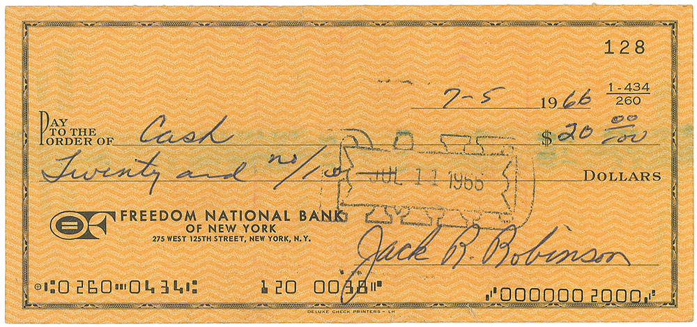 Choice bank check, 6 x 2.75, filled out and signed by Robinson, “Jack R. Robinson,” payable to cash for $20, July 5, 1966. In fine condition, with expected bank stamps. A desirable format featuring Robinson’s more formal signature. Pre-certified Steve Grad/PSA/DNA and RR Auction COA.