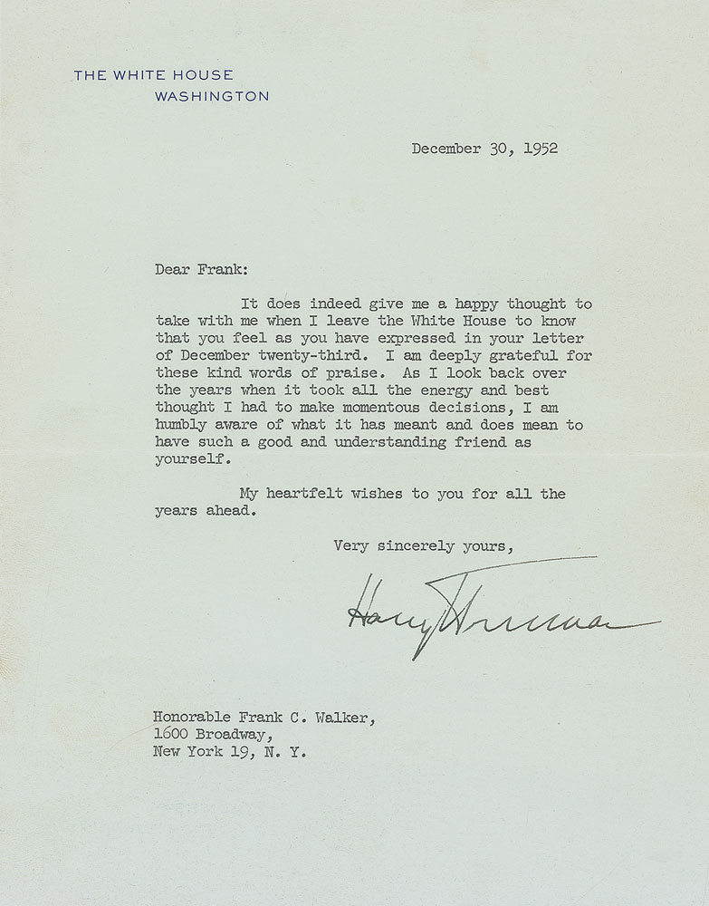 TLS as president, one page, 7 x 8.75, White House letterhead, December 30, 1952. Letter to Hon. Frank C. Walker. In part: “It does indeed give me a happy thought to take with me when I leave the White House to know that you feel as you have expressed in your letter of December twenty-third. I am deeply grateful for these kind words of praise. As I look back over the years when it took all the energy and best thought I had to make momentous decisions, I am humbly aware of what it has meant and does mean to have such a good and understanding friend as yourself.” In fine condition. Walker was an attorney who served as treasurer and chairman of the Democratic National Committee, as well as postmaster general from 1940 to 1945. Pre-certified John Reznikoff/PSA/DNA and RR Auction COA.