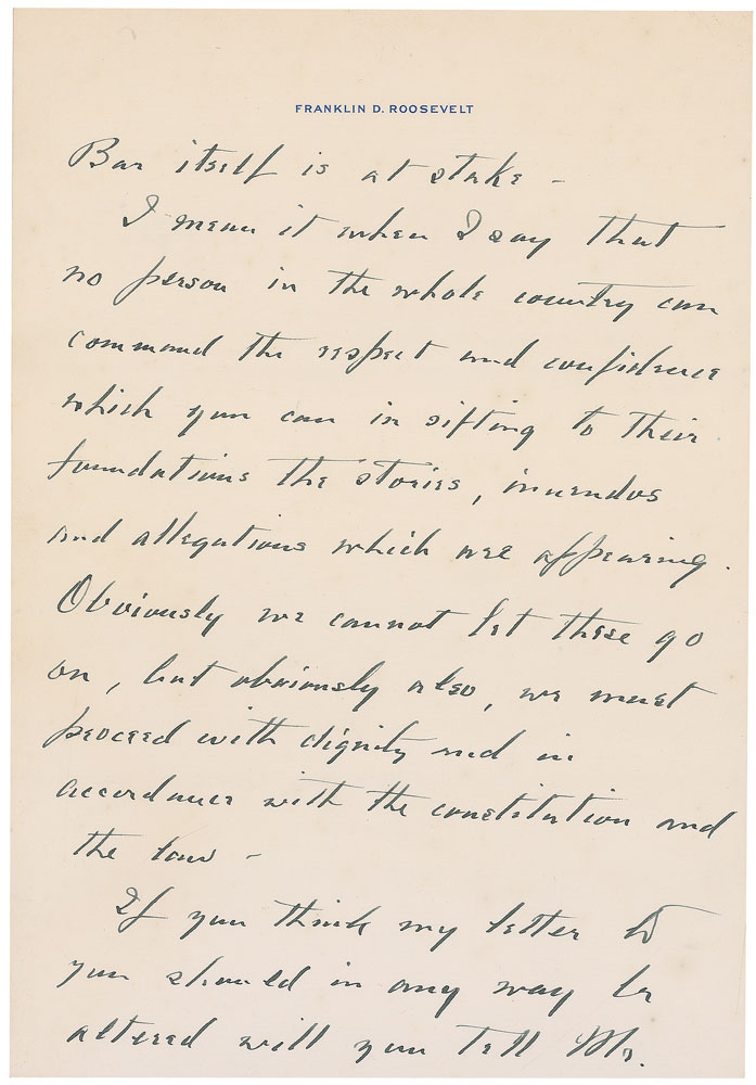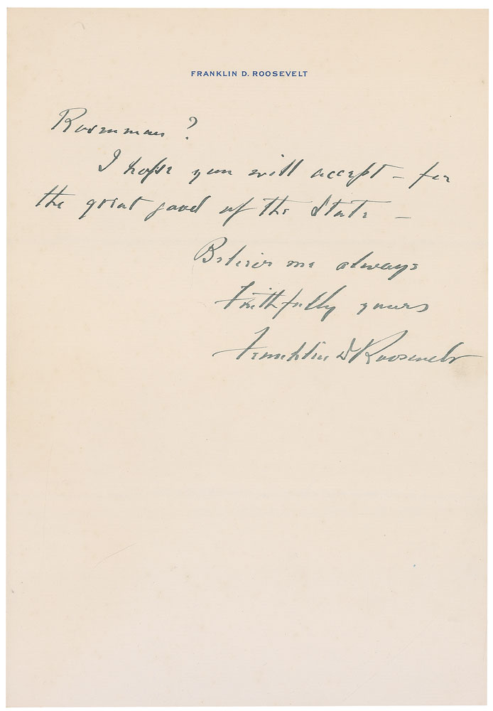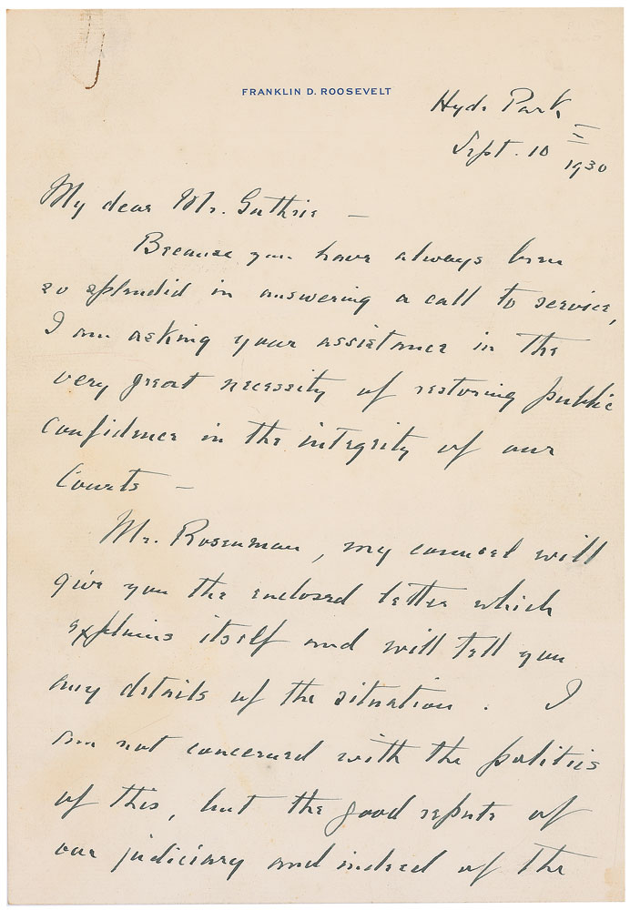 ALS, three pages, 7.25 x 10.5, personal letterhead, September 10, 1930. Letter to William D. Guthrie. In full: “Because you have always been so splendid in answering a call to service I am asking your assistance in the very great necessity of restoring public confidence in the integrity of our Courts—Mr. Rosenman, my counsel will give you the enclosed letter which explains itself and will tell you any details of the situation. I am not concerned with the politics of this, but the good reports of our judiciary and indeed of the Bar itself is at stake—I mean it when I say that no person in the whole country can command the respect and confidence which you can in sifting to their foundations the stories, innuendoes and allegations which are appearing. Obviously we cannot let these go on, but obviously also, we must proceed with dignity and in accordance with the constitution and the law—If you think my letter to you should in any way be altered will you tell Mr. Rosenman? I hope you will accept—for the great good of the State.” In fine condition, with a rusty paperclip impression to the upper left. Accompanied by Guthrie’s retained carbon copies of his response, declining the request. Roosevelt had become governor in 1929, inheriting what was left of the corrupt Tammany Hall political machine that had pervaded state politics for decades. This letter must have been spurred by the disappearance of Joseph Force Crater, an associate justice of the New York Supreme Court, who had gone missing in early August. No alarm was raised—he had said he was going on a trip—until August 25, when he failed to appear for the opening of the courts, but the police were not notified until September 3. The case immediately became front-page news and received widespread publicity, but no trace of Force was ever found. The suspicious circumstances of the vanished judge added to public disquiet about corruption in city government—and as FDR points out here, undermined the integrity of the state’s legal system. Pre-certified John Reznikoff/PSA/DNA and RR Auction COA.