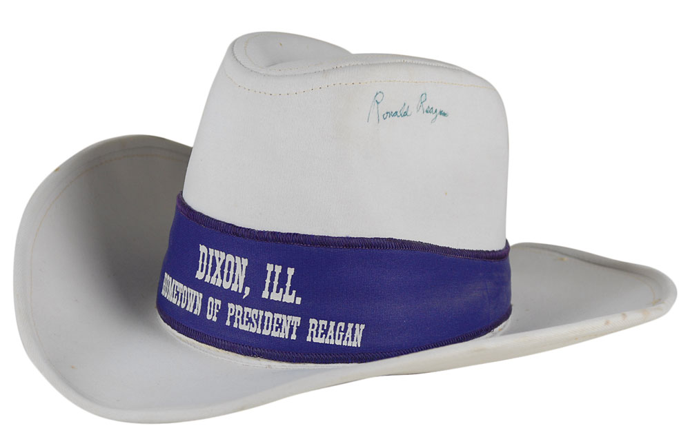 White cowboy hat with a purple band honoring Reagan’s hometown of Dixon, Illinois, clearly signed on the side in felt tip by Reagan. In fine condition, with some expected light spreading of ink due to nature of material, and some light spotting to hat. Accompanied by a letter of provenance from Ken Wendland, who states that the “hat was signed while I…visited President Reagan at his office on October 13, 1989. The autograph is verified by the photo taken in his office on October 13, 1989.” Also accompanied by a color copy of aforementioned photo, showing Reagan with Wendland and his family, with the hat in Wendland’s hand. RR Auction COA.
