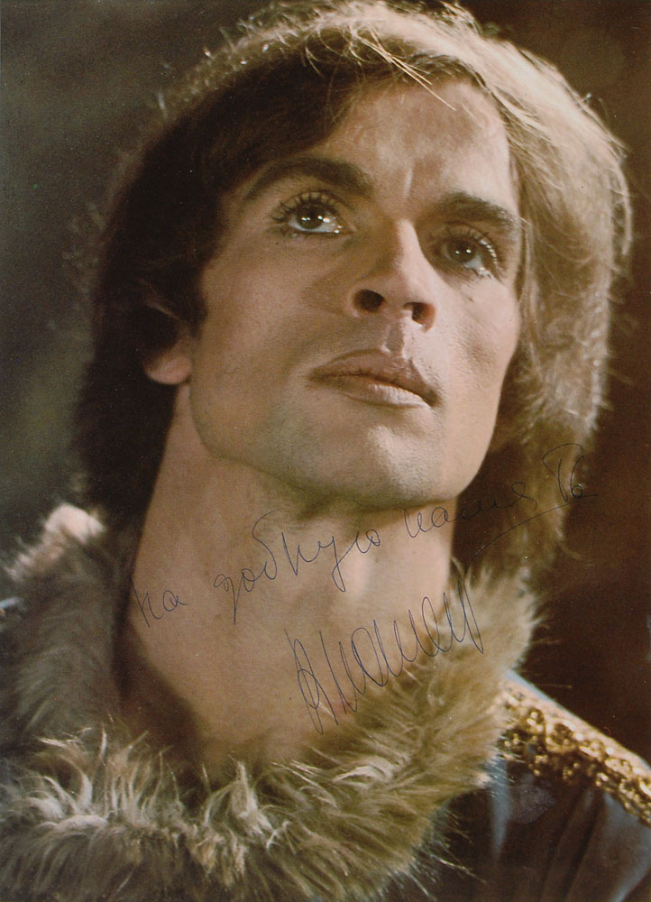 Color 8.5 x 11.75 close-up photo of Nureyev in costume, signed and inscribed in Russian in blue ballpoint. Double-matted and framed to an overall size of 15.5 x 19. In fine condition. Pre-certified PSA/DNA.