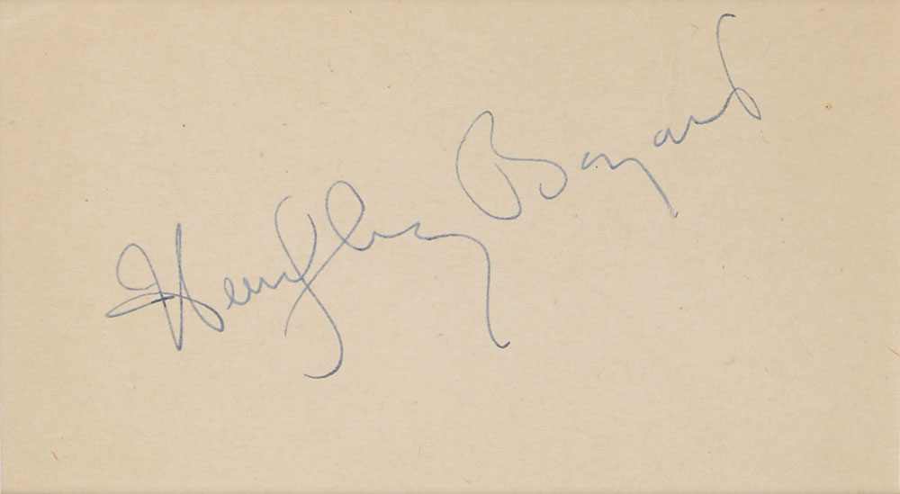 Vintage fountain pen signature, “Humphrey Bogart,” on an off-white 4.5 x 2.5 album page. Handsomely double-matted and framed with a portrait to an overall size of 14 x 19.75. In fine condition. Pre-certified PSA/DNA.