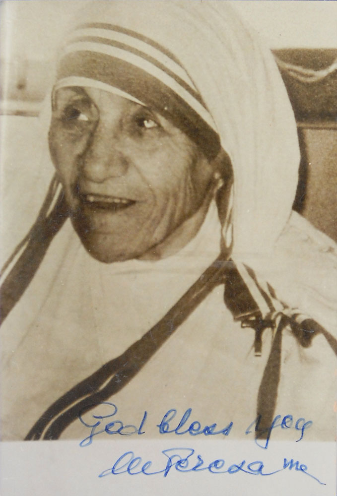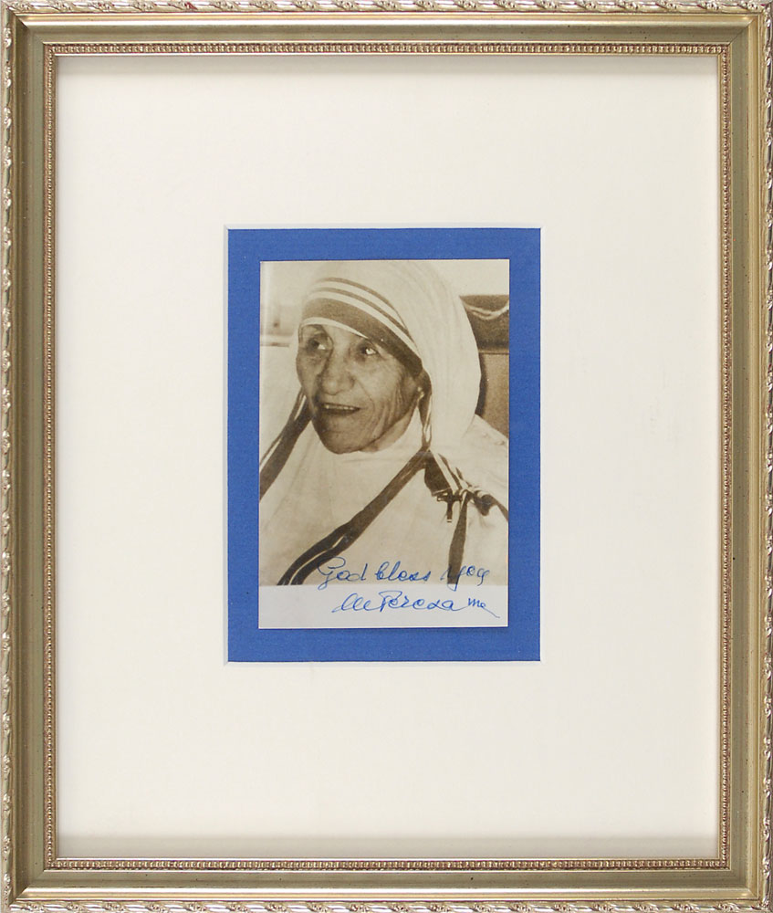 Glossy 3 x 4.25 photo of Mother Teresa, signed at the bottom of the image in blue felt tip, “God bless you, M Teresa mc.” Matted and framed to an overall size of 9 x 11. In fine condition, with a scuff to the frame’s plexiglass. Pre-certified PSA/DNA and RR Auction COA.