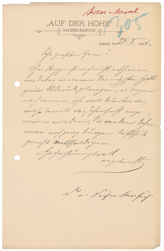 Austrian writer and journalist (1836–1895) from whose name the word masochism is derived. Untranslated LS in German, one page, 5.75 x 9, personal letterhead, August 24, 1884. In fine condition, with a few trivial edge tears, two punch holes to the left edge, and notations to upper right. Pre-certified PSA/DNA and RR Auction COA.