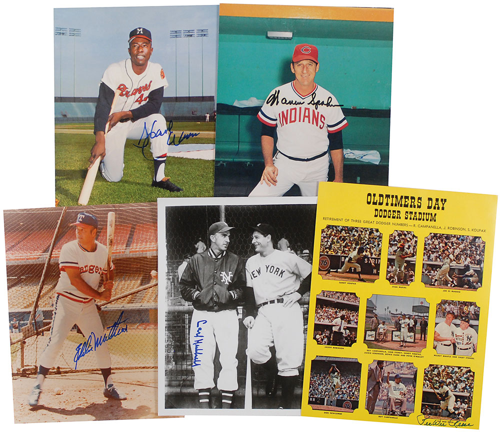 Five color photos, various finishes, 8 x 10 and 8.5 x 11, each signed in blue or black felt tip by the Hall of Famer pictured, including: Hank Aaron, Carl Hubbell, Warren Spahn, and Pee Wee Reese. In overall fine condition, with haloing to Spahn’s signature. RR Auction COA.