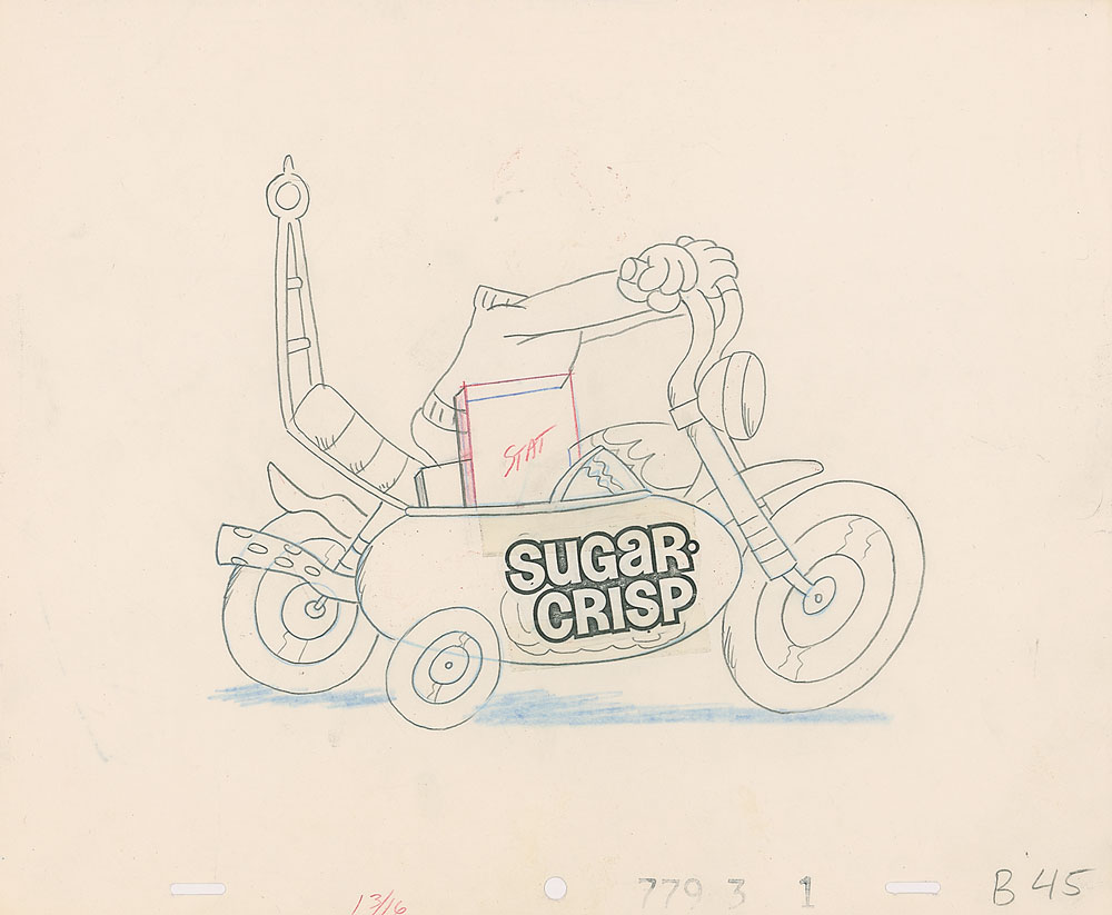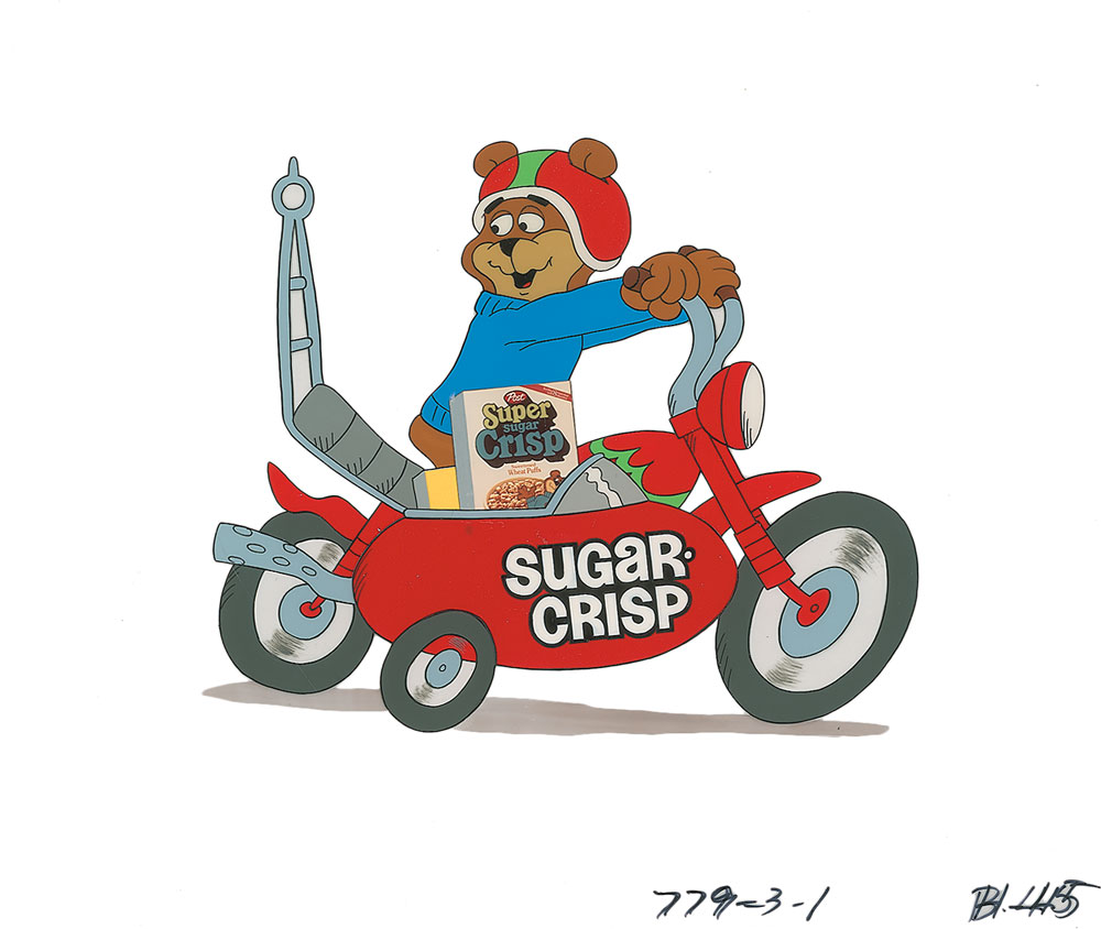 (1980s) Original production cel featuring Sugar Bear from a 1980s Super Sugar Crisp cereal television commercial. Image measures 8.25 x 6.5, with overall dimensions of 12.5 x 10. Corresponding production drawing of the headless bear on his motorcycle is on a 12.5 x 10.5 untrimmed animation sheet. In fine condition.