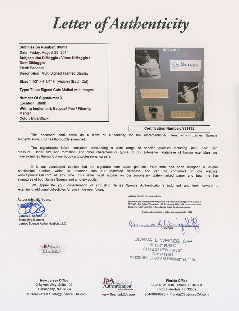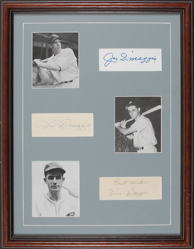 Felt tip and ballpoint signatures of Joe DiMaggio, Dom DiMaggio, and Vince DiMaggio on individual off-white cards. Matted with images of each brother and framed to an overall size of 13.5 x 17.5. In fine condition. RR Auction COA.