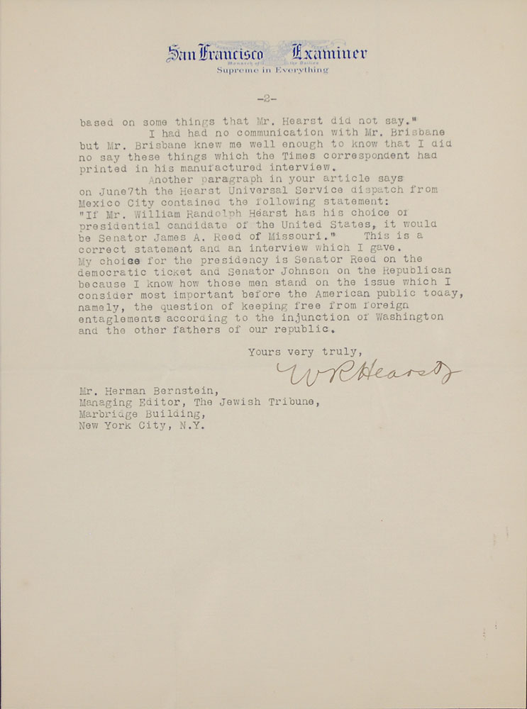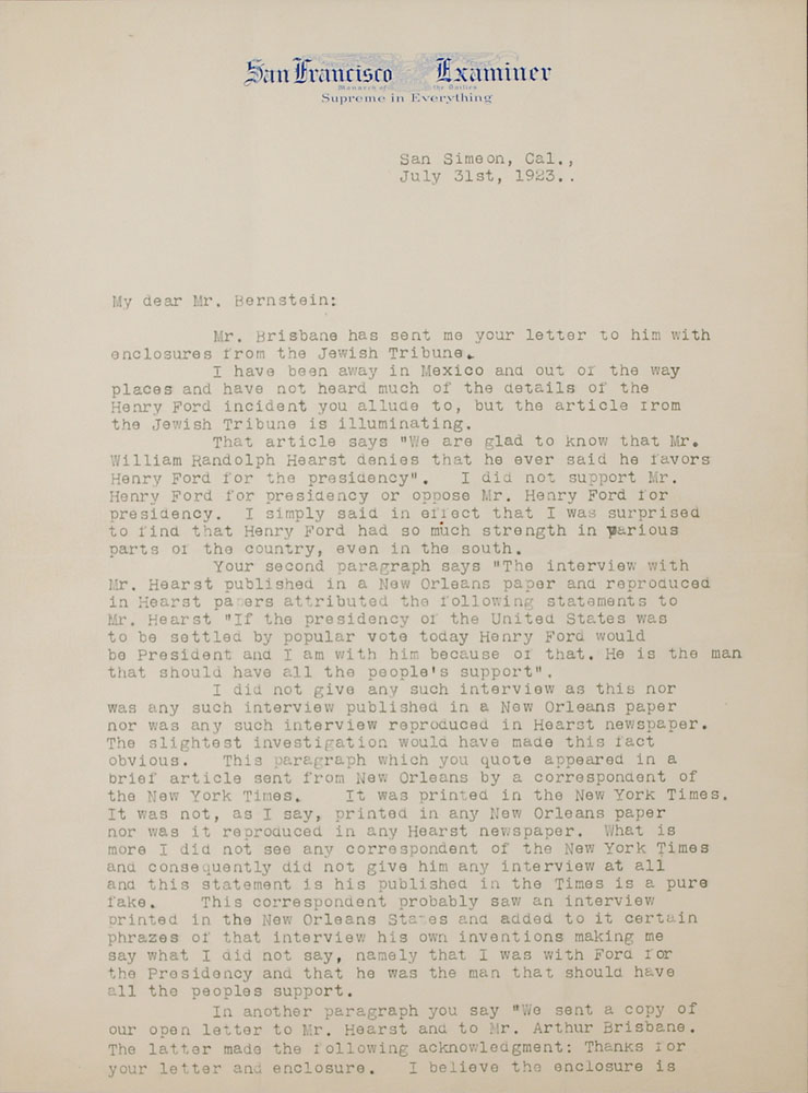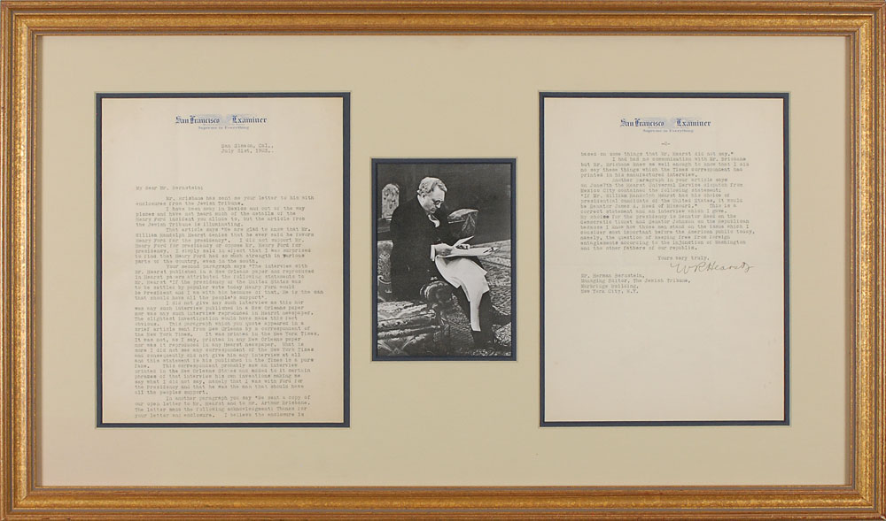 TLS signed “W. R. Hearst,” two pages, 7.75 x 10.5, San Francisco Examiner letterhead, July 31, 1923. Letter to Herman Bernstein, editor of the Jewish Tribune. In part: “I have been in Mexico and out of the way places and have not heard much of the details of the Henry Ford incident you allude to, but the article from the Jewish Tribune is illuminating. That article says ‘We are glad to know that Mr. William Randolph Hearst denies he ever said he favors Henry Ford for the presidency.’ I did not support Mr. Henry Ford for presidency or oppose Mr. Henry Ford for presidency. I simply said in effect that I was surprised to find that Henry Ford had so much strength in various parts of the country, even in the south…The slightest investigation would have made this fact obvious…I did not see any correspondent of the New York Times and consequently did not give him any interview at all and this statement…published in the Times is a pure fake. This correspondent probably saw an interview published in the New Orleans States and added to it…his own inventions making me say what I did not say, namely that I was with Ford for the presidency and that he was the man that should have all the peoples support…My choice for the presidency is Senator Reed on the Democratic ticket and Senator Johnson on the Republican because I know how those men stand on the issue which I consider most important before the American public today, namely, the question of keeping free from foreign entanglements according to the injunction of Washington and the other fathers of our republic.” Handsomely double-matted and framed with a photo of Hearst to an overall size of 28.75 x 17. In fine condition, with intersecting folds passing through the signature. Ford as a presidential candidate appealed to several disparate political factions as a ‘self-made man’ and the ‘people’s tycoon,’ who latched on to his neo-Populist rhetoric against ‘profiteers’ and ‘Wall Street.’ A poll conducted by Collier’s magazine in the spring of 1923 even had Ford as the front runner for the 1924 election, leading all candidates including the incumbent Warren G. Harding. In addition to the political content and discussion of Ford, Hearst’s letter is intriguing in its assertions against competing newspapers, harkening back to the newspaper wars that Hearst had fought during the rise of his publishing empire. Pre-certified PSA/DNA.
