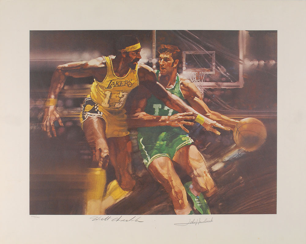 Color limited edition 25 x 20 print of a strongly stylized depiction of Chamberlain and Havlicek competing on the hardwood, numbered 440/1000, signed in the lower border in pencil by both. In fine condition, with light creasing and soiling to borders. These difficult-to-find prints were issued in the 1970s by Sports Illustrated as part of the ‘Living Legend’ series. Pre-certified Steve Grad/PSA/DNA and RR Auction COA.