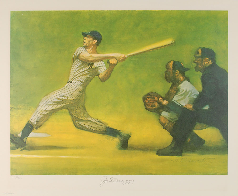 Color limited edition 22 x 18 print of a skillful portrayal of DiMaggio swinging, numbered 1473/1500, signed in the lower border in pencil. In fine condition. These difficult-to-find prints were issued in the 1970s by Sports Illustrated. Pre-certified Steve Grad/PSA/DNA and RR Auction COA.