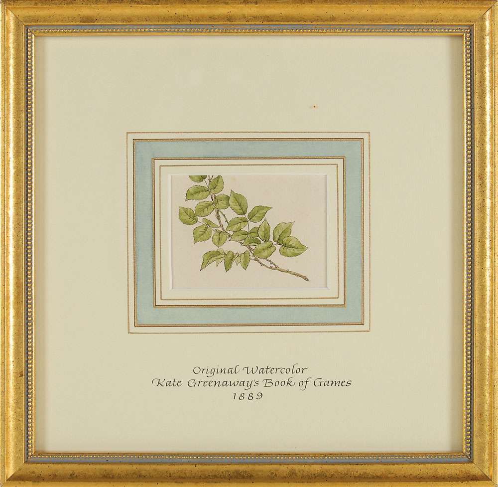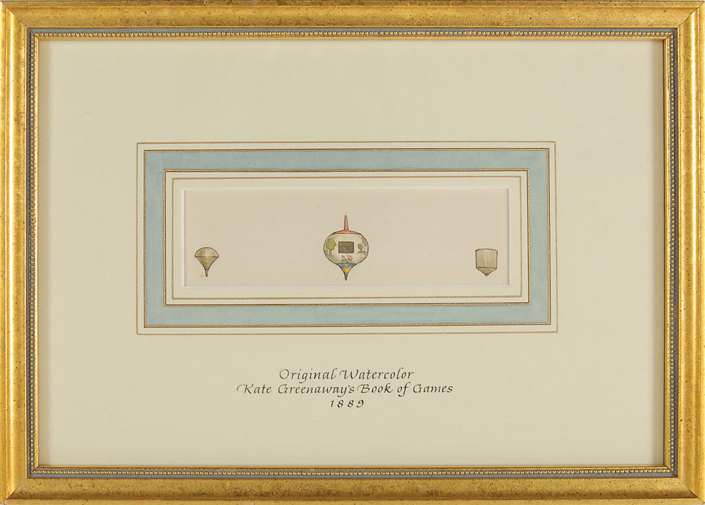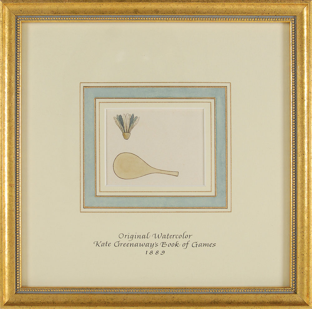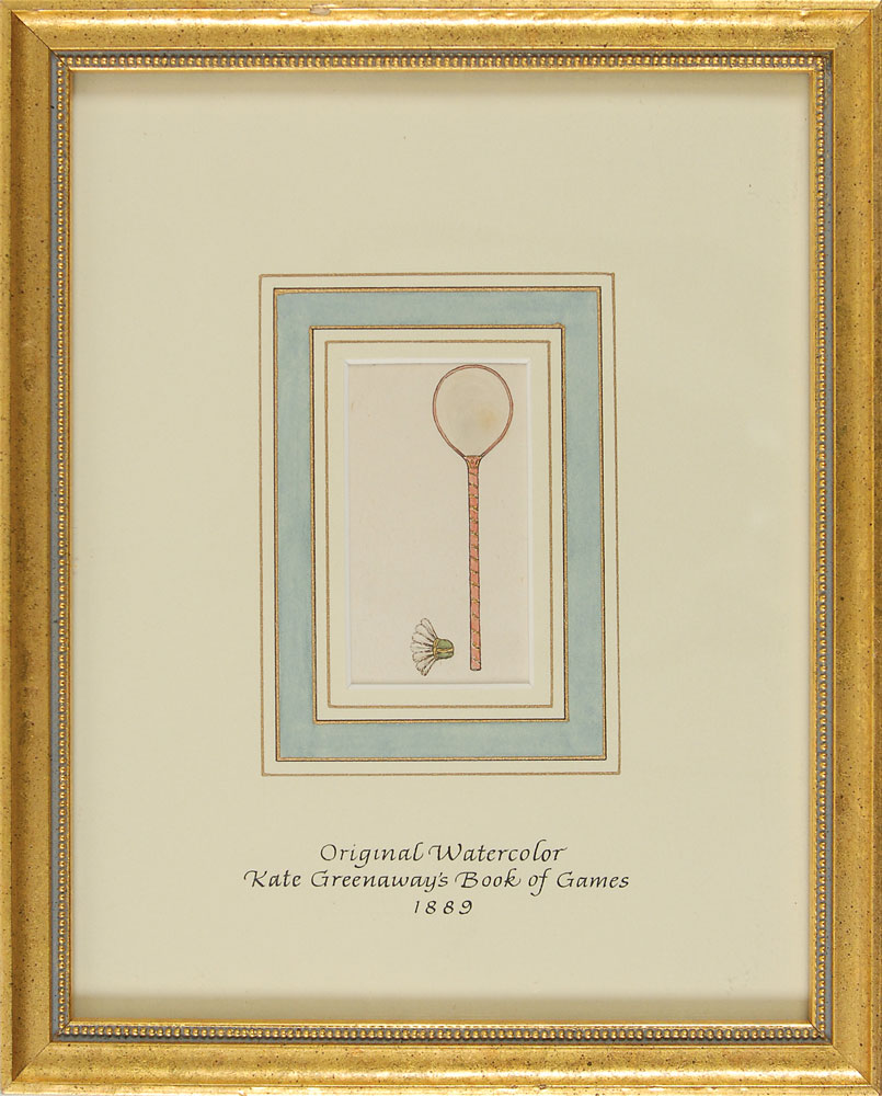 British children’s author and illustrator (1846–1901) whose distinctively illustrated books were among the most popular ‘juvenile’ works of the Victorian age. Fabulous collection of unsigned original ink and watercolor illustrations used in her Book of Games, published in 1889, accomplished on four small individual off-white sheets ranging in size from 1.5 x 2.25 to 5.25 x 1.5. The illustrations depict a badminton racquet and birdie; a paddle and shuttlecock; a group of three spinning tops; and a leafy branch. They are nicely matted and framed to overall sizes of approximately 8 x 10, with calligraphic descriptions on each mat. In overall fine condition. The delightfully illustrated book contained playful descriptions of a variety of games for children. It featured 24 plates depicting the games, with these illustrations used to embellish the borders surrounding the text. Of the present group, the two illustrations with racquets appear on the page for ‘Battledore & Shuttlecock,’ the spinning tops decorate the bottom of the page for ‘Tops,’ and the leafy tree branch is shown next to the text for ‘Ball.’ A supremely desirable set of original production illustrations from the classic children’s illustrator.