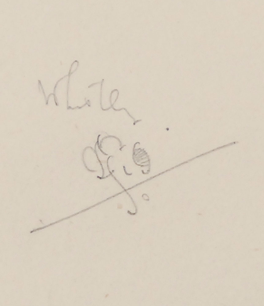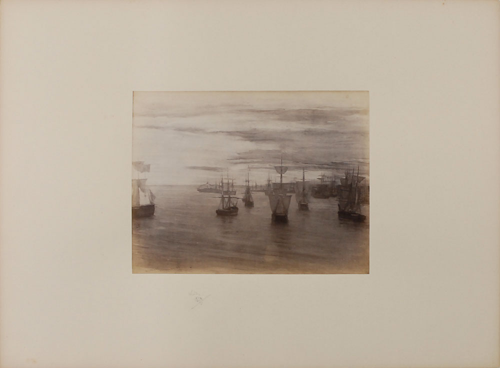 Magnificent and extremely desirable 10 x 7.5 albumen photo of Whistler’s 1866 work entitled ‘Crepuscule in Flesh Colour and Green: Valparaiso,’ affixed to an off-white 21 x 15.5 mount, signed on the mount in pencil, “Whistler,” adding his famous ‘butterfly’ signature below. In fine condition, with light edge toning and mild rippling to mount. From the from private collection of American painter Chauncey Ryder, whose work can be found at several institutions including the Whistler House Museum of Art. Whistler made a curious trip to Valparaiso, Chile, in 1866, where he observed the conflict resulting from the Spanish occupation of the Chincha Islands. When he arrived in early March, Whistler found a squadron of Spanish ships blockading the country's main harbor at Valparaiso, along with British, American, and French fleets present to induce peace. By the end of the month, Spain had announced its unwavering intent to bombard the city and the foreign peacekeepers were forced to withdraw in their own interest. This image is thought to depict the beginning of this withdrawal on the evening of March 30; Valparaiso was bombarded the next day, while Whistler had fled to the hills on horseback seeking safety. An absolutely remarkable image in a rare oversized format. Pre-certified PSA/DNA.