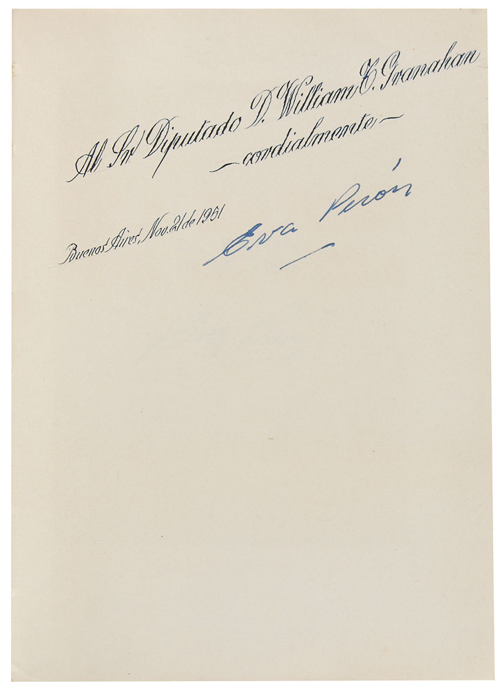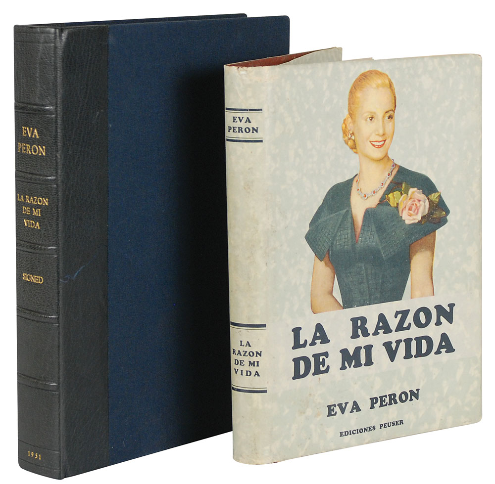 Signed book: La Razon de Mi Vida. Buenos Aires: Ediciones Peuser, 1951. Hardcover with dust jacket, 6 x 8, 317 pages. Signed on the first free end page in fountain pen, “Eva Peron,” beneath a calligraphic inscription in Spanish to William C. Granahan, dated November 21, 1951. In fine condition, with light scattered foxing to dust jacket. Accompanied by an appealing custom-made clamshell presentation case. Pre-certified PSA/DNA and RR Auction COA.