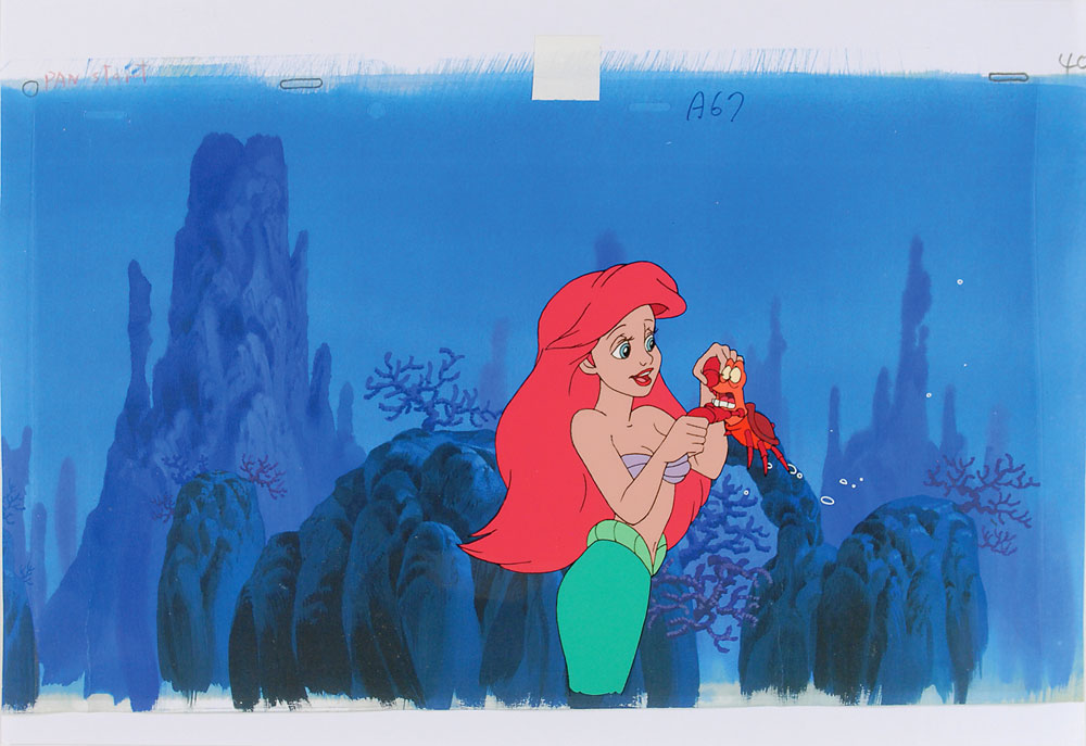 (Walt Disney Studios, 1992) Original production cel featuring Ariel and Sebastian from The Little Mermaid, showing her grabbing the frightened crab by his claws. The cel is placed on a color copy background. Image measures 5 x 6.5, with overall dimensions of 16 x 11. In fine condition. RR Auction COA.
