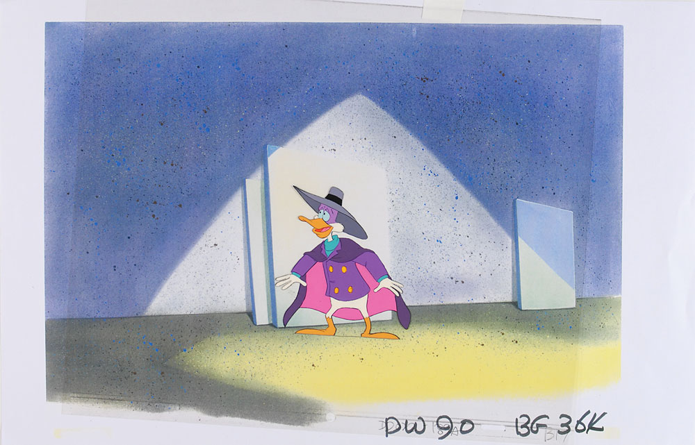 (Walt Disney Studios, 1991) Very scarce original production cel featuring Darkwing Duck from the Darkwing Duck television show, depicting the popular crime-fighter in his recognizable purple outfit. The cel is placed on a color copy background. Image measures 3.5 x 4, with overall dimensions of 17 x 11. In fine condition. RR Auction COA.
