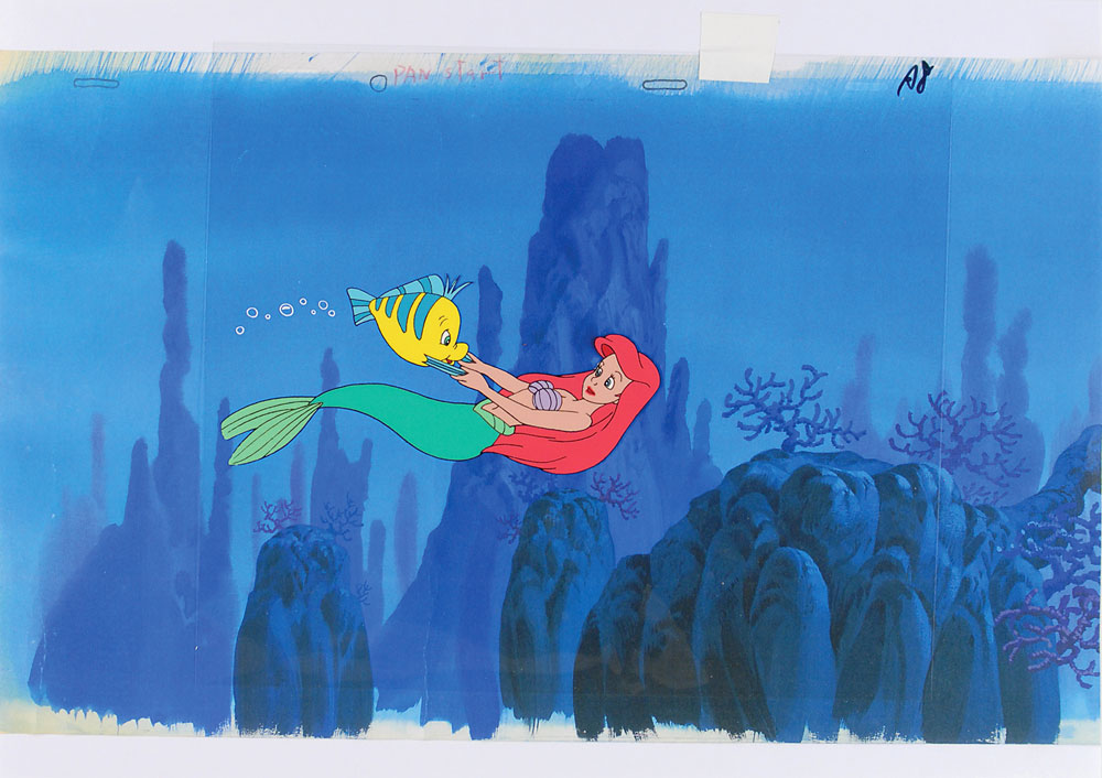 (Walt Disney Studios, 1992) Original production cel featuring Ariel and Flounder from The Little Mermaid television show, depicting the crimson-haired undersea beauty holding hands with her skittish sidekick. The cel is placed on a color copy background. Image measures 6.25 x 2.75, with overall dimensions of 15.5 x 11. In fine condition. RR Auction COA.