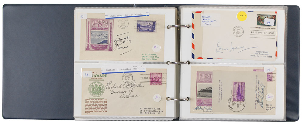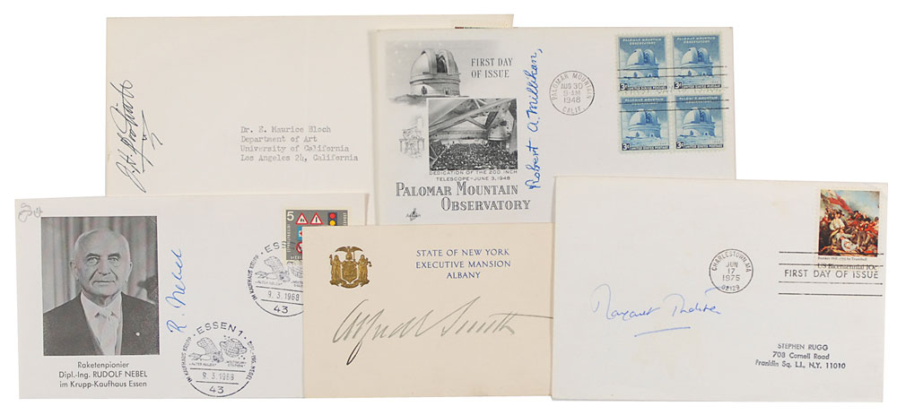 Collection of approximately 150 items comprised of covers, cards, and free franks, each signed by a notable figure from an array of fields such as military, and politics, including: James Doolittle, Charles Curtis, Lillian Gish, Alexander Seversky, Fiorello La Guardia, Margaret Thatcher, James Farley, Robert Millikan, Albert Lebrun, Rudolf Nebel, Al Smith, and Irving Wallace. In overall fine condition. RR Auction COA.