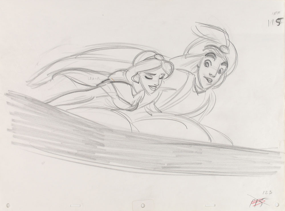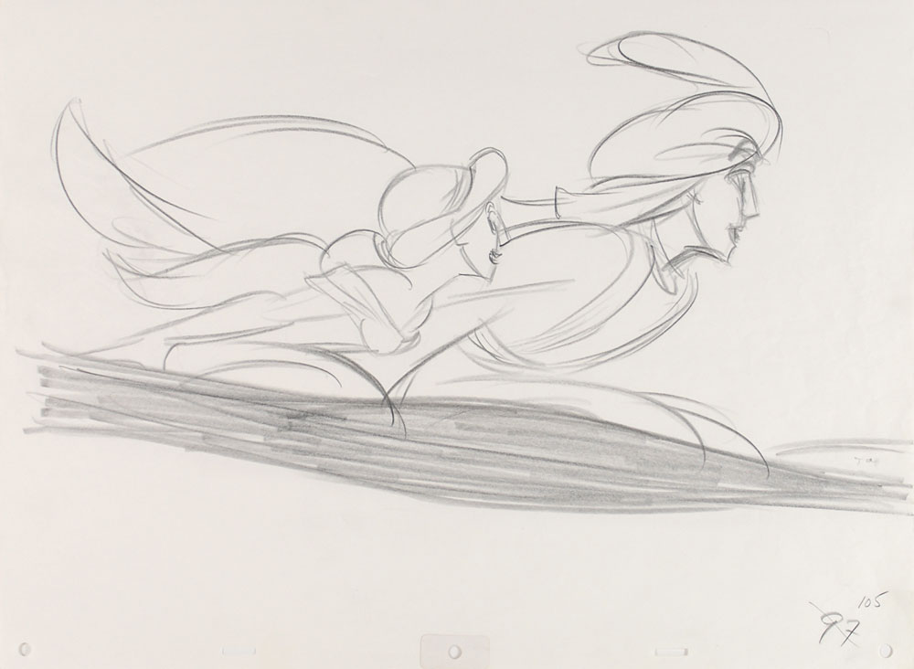(Walt Disney Studios, 1993) Two original rough production drawings featuring Aladdin and Jasmine from Aladdin, showing the lovestruck pair flying on his magic carpet during the classic ‘A Whole New World’ scene. Accomplished in graphite on untrimmed 17 x 12.5 animation paper. Images measure about 12 x 7. In fine condition, with moderate creases to the left side of one sheet. An excellent pairing of large, bold, and detailed rough production drawings. RR Auction COA.