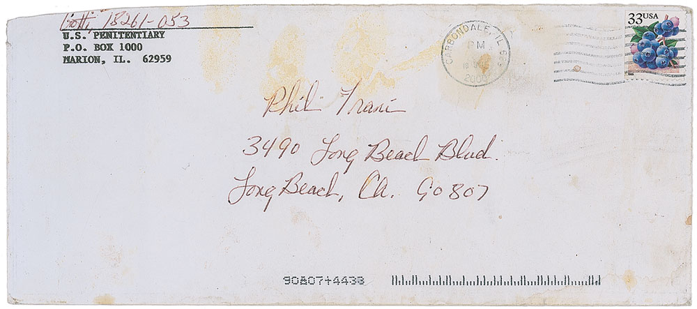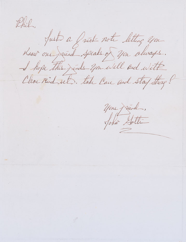 Uncommon ALS, one page, 8.5 x 11, July 19, 2000. Letter written from prison to a friend. In full: “Just a quick note letting you know our friend speaks of you always. I hope this finds you well and with clear mind set, take care and stay strong!” In very good condition, with scattered creases, a few edge tears, and a few light stains. Accompanied by the original mailing envelope, addressed in Gotti’s hand with his name incorporated in the return address area, “Gotti, 18261-053.” Pre-certified PSA/DNA.