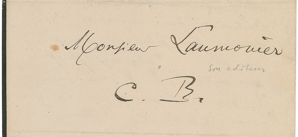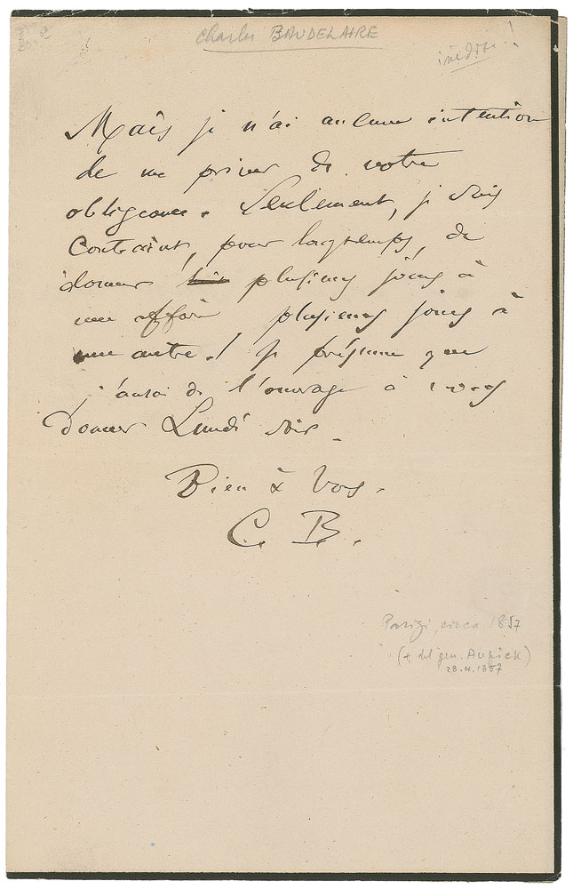 Influential nineteenth-century French writer (1821–1867) best known for his highly imaginative and experimental verse, including the seminal 1857 collection Les Fleurs du Mal. ALS in French, signed “C. B.,” one page, 5.25 x 8.25, no date but circa 1850s. Letter to his copyist, Monsieur Laumonier. In full (translated): “But I have no intention of depriving myself of your kindness, however I have been content for a long time to give certain days to one affair, and several days to another affair. I presume that I will have the work ready to give you Monday evening.” Also addressed and initialed on the reverse of the second integral sheet, “Monsieur Laumonier, C. B.” In fine condition. Baudelaire worked with Laumonier while translating the short stories of Edgar Allan Poe, releasing the first volume in 1856 under the title Histoires extraordinaires. The importance of Baudelaire’s interest in Poe is multifaceted—on a practical level, the translations brought him income in a time of financial distress. He also admired Poe, regarding him not only as an influence but as a kindred spirit, both of them ‘starving artist’ writers who embraced the fantastic, macabre, and grotesque. Baudelaire’s translations had a broader literary impact as well, considerably contributing to Poe’s popularity and favorable reception in Europe, particularly among the symbolists and surrealists. Pre-certified John Reznikoff/PSA/DNA.