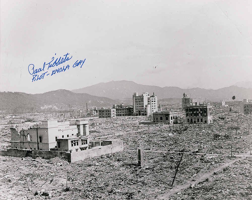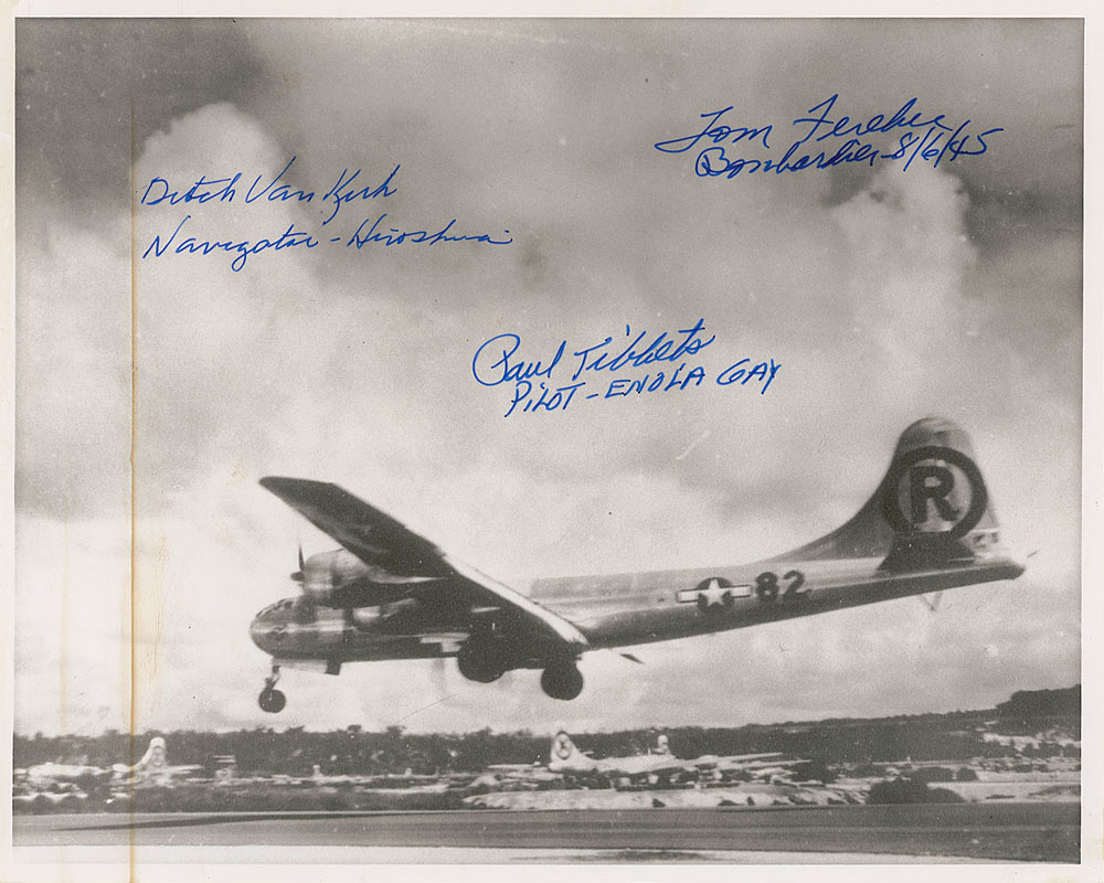 Three items: a glossy 8 x 10 photo of the Hiroshima plume, signed in blue felt tip, “George R. Caron, Hiroshima, 8/16/45”; a satin-finish 10 x 8 photo of the bomb’s devastating aftermath, signed in blue felt tip, “Paul Tibbets, Pilot - Enola Gay”; and a glossy 8 x 10 photo of the Enola Gay, signed in blue felt tip, “Dutch Van Kirk, Navigator - Hiroshima,” “Paul Tibbets, Pilot - Enola Gay,” and “Tom Ferebee, Bombardier - 8/6/45.” In overall fine condition, with one vertical line of discoloration to the Enola Gay photo. Pre-certified PSA/DNA.