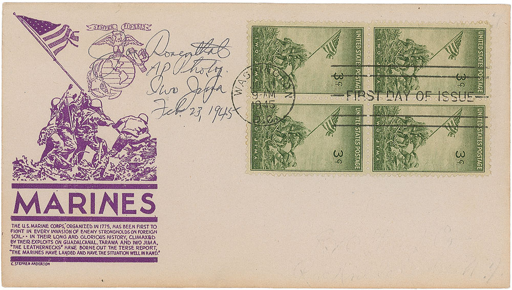 FDC with a cachet honoring the Marines, with four Iwo Jima postage stamps, signed in ballpoint, “Rosenthal, AP Photog., Iwo Jima, Feb, 23, 1945.” In fine condition, with indentations from a removed pencil address to lower right. Pre-certified PSA/DNA.