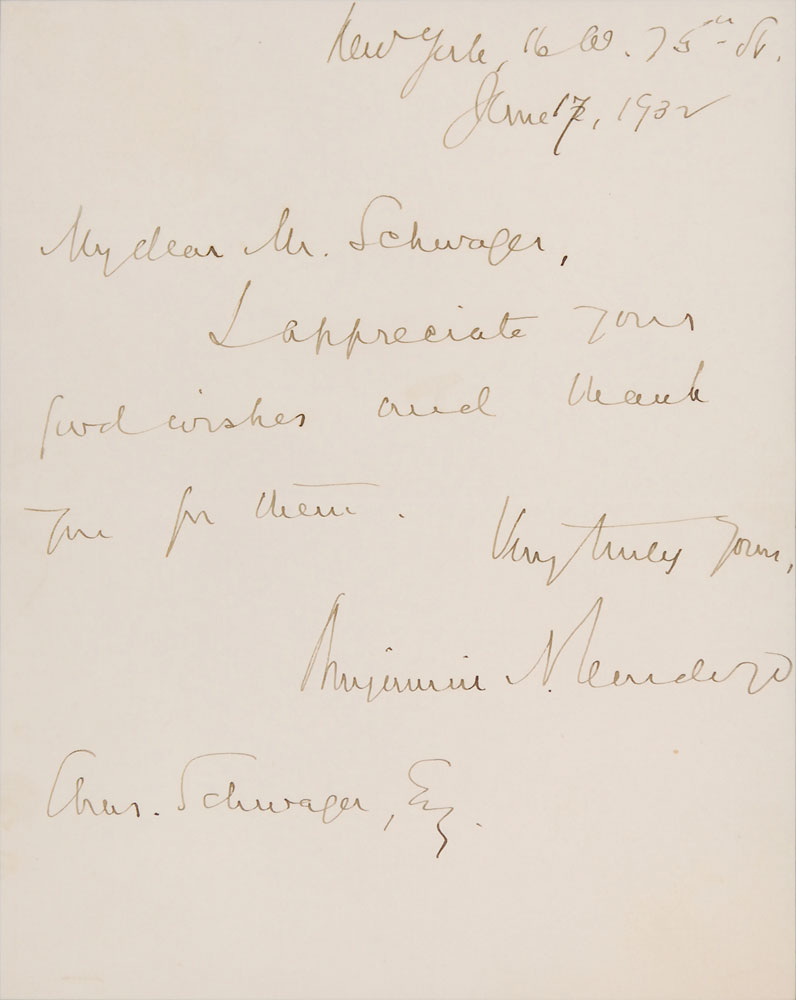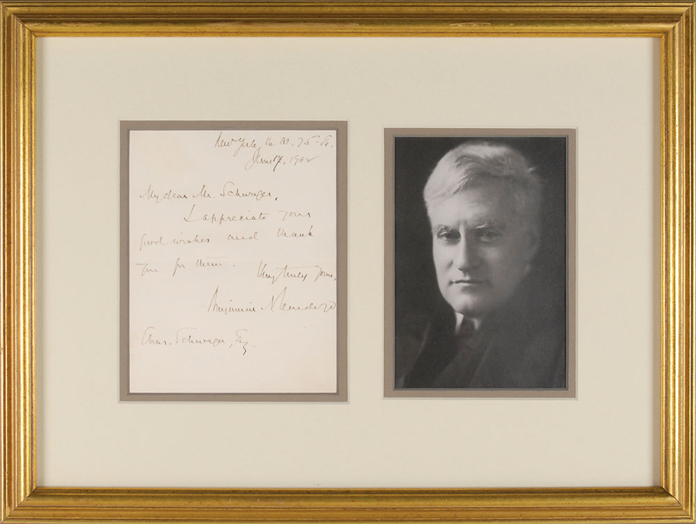ALS signed “Benjamin N. Cardozo,” one page, 5.25 x 6.75, June 17, 1932. Letter to Charles Schwager, in full: “I appreciate your fond wishes and thank you for them.” Impressively double-matted and framed with a handsome portrait of the influential Supreme Court judge to an overall size of 17.5 x 13.25. In fine condition. Pre-certified PSA/DNA.