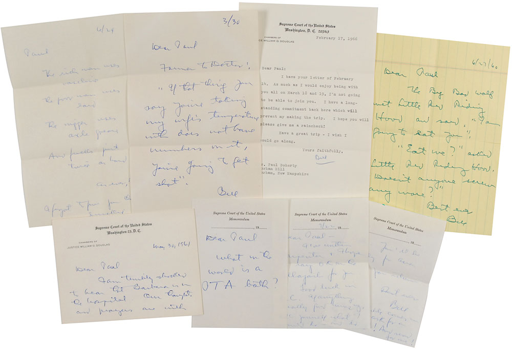 Small archive of mostly humorous notes and letters sent by Douglas to Paul Doherty of New Hampshire, dated between 1960 and 1966, comprised of four ALSs, two ANSs on Supreme Court memo paper, and a TLS on Supreme Court letterhead. All are signed “Bill” except for one, which is unsigned. One ALS, in full: “The Big Bad Wolf met Little Red Riding Hood and said ‘I am going to eat you.’ ‘Eat me?’ asked Little Red Riding Hood, ‘Doesn’t anyone screw any more?’” Another ALS, in full: “Farmer to Doctor: ‘If that thing you say you’re taking my wife’s temperature with does not have numbers on it, you’re gong to get shot.” A third ALS, in full: “The rich man uses vaseline / The poor man uses lard / The nigger uses axle grease / and fucks just twice as hard.” In overall fine condition. Accompanied by four of the original mailing envelopes, three of which are addressed in Douglas’s hand. Pre-certified PSA/DNA.