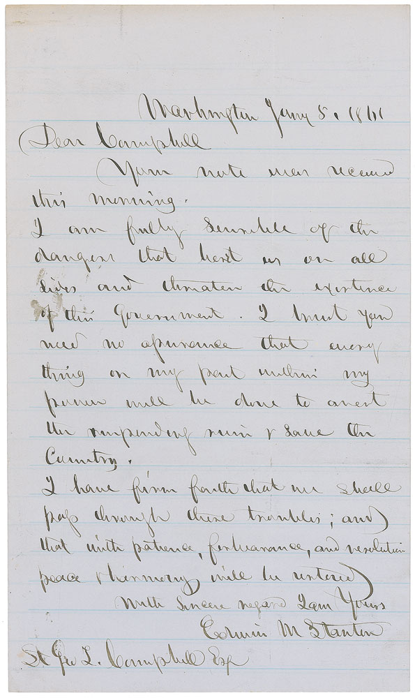 Fantastic ALS, one page, 5.25 x 9.25, January 5, 1861. Letter to Lieutenant George L. Campbell. In part: “I am fully sensible of the dangers that beset us on all lives and threaten the existence of this Government. I trust you need no assurance that every thing on my part within my power will be done to avert the impending ruin & save the Country. I have firm faith that we shall pass through these troubles; and that with patience, forbearance, and resolution, peace & harmony will be returned.” In fine condition, with intersecting folds and light brushing to ink in a few words. At this time, Stanton was serving as attorney general in the Buchanan administration before becoming secretary of war under Lincoln in 1862. Pre-certified PSA/DNA.