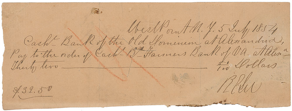 Scarce and extremely desirable handwritten check, 7.75 x 2.75, filled out and signed by Lee, “R. E. Lee,” payable to “Cash—B—Farmers Bank of Va” for $32.50, July 5, 1854. Lee adds further information at the top, “West Point, N. Y., Cash—Bank of the Old Dominion at Alexandria.” Several vertical folds, light creases and soiling, noticeable wrinkling to signature area, adhesive remnants on reverse, and an expected cancellation cut and notation to body, otherwise very good condition. Accompanied by an engraved portrait of Lee. After distinguishing himself in the Mexican-American War, Lee reluctantly accepted an appointment as superintendent of the Military Academy at West Point in 1852, where he remained for three years. During this time he managed his affairs from afar, banking in his boyhood home of Alexandria with the Bank of the Old Dominion and Farmers Bank of Virginia, both of which would close during the Civil War. Pre-certified PSA/DNA.