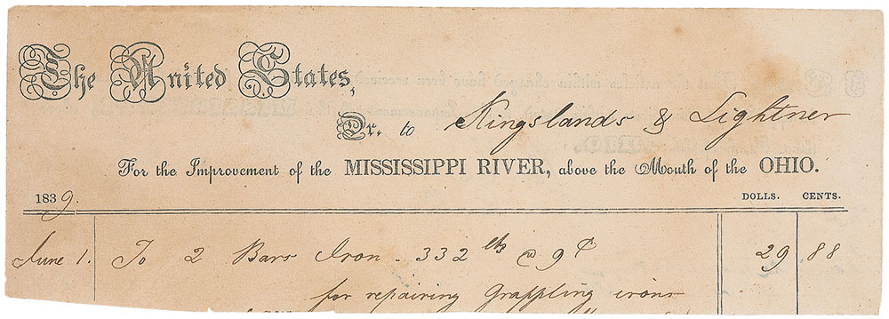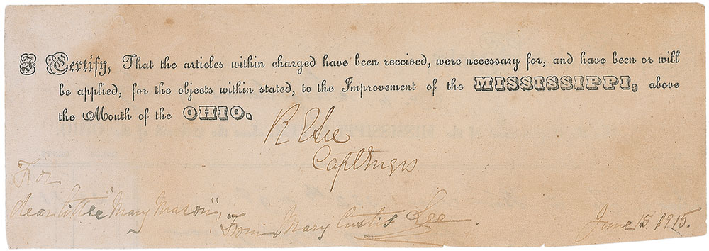 Partial self-contained partly-printed DS, signed “R. E. Lee, Capt. Engrs.,” one page, 8 x 2.75, no date but circa June 1839. Lee certifies the necessity and receipt of supplies for the “Improvement of the Mississippi, above the Mouth of the Ohio.” The reverse is filled out in another hand with the purchase order, submitted to the firm Kingslands & Lightner and dated June 1, 1839, for “2 Bars Iron—332 lbs @ 9¢, for repairing grappling irons,” totaling $29.88. This was clipped from the top of a larger document by Lee’s eldest daughter, Mary Custis Lee, to give as a gift to family friend Mary Mason Anderson, signed and inscribed at the bottom, “For dear little ‘Mary Mason,’ from Mary Custis Lee, June 15, 1915.” In fine condition, with light toning and expected document wear. Mary Mason Anderson was the granddaughter of Joseph Reid Anderson, an iron manufacturer and Confederate army officer, whose Tredegar Iron Company was the largest producer of munitions, cannon, railroad iron, steam engines, and other ordnance for the Confederacy—perhaps it was this ironworks association that inspired Mary Custis Lee to present this specific autograph of her father. At the time he signed this, Lee was a decade removed from graduating West Point as a lieutenant in the Corps of Engineers. Between 1837 and 1842, he supervised the development of St. Louis harbor and the upper Mississippi and Missouri rivers, ultimately earning a promotion to captain for his work there. A highly desirable document in both its early date and direct family provenance. Pre-certified PSA/DNA.