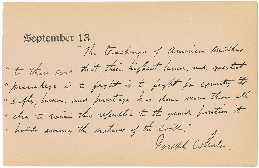 Confederate major general (1836–1906), known as ‘Fightin’ Joe,’ who led his troops in vigorous opposition to Sherman during the Atlanta campaign. AQS, signed “Joseph Wheeler,” on an off-white 7.75 x 5 sheet, dated September 13. Wheeler writes: “The teachings of American mothers to their sons that their highest honor, and greatest privilege is to fight is to fight [sic] for country its safety, honor, and prestige has done more than all else to raise this republic to the grand position it holds among the nations of the earth.” In fine condition, with a uniform shade of mild toning. A poignant and patriotic quote from the hard-driving officer, who would serve the Confederacy for the duration of the war, and would later rejoin the US Army serving with distinction at the turn of the century. Pre-certified PSA/DNA.