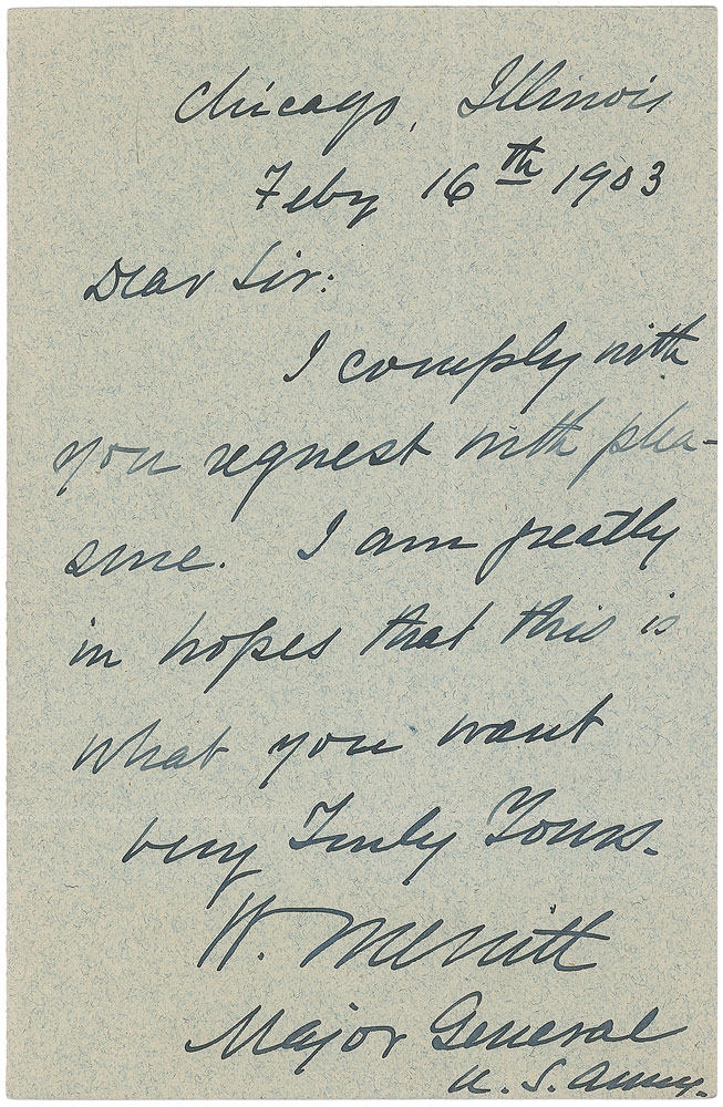 Union general (1836–1910) who served in the Civil War and the Spanish-American War, noted for distinguished service in the cavalry. Boldly penned ALS signed “W. Merritt, Major General, U. S. Army,” one page, 4.5 x 7, Chicago, February 19, 1903. Brief letter to a gentleman. In full: “I comply with your request with pleasure. I am greatly in hopes that this is what you wanted.” In fine condition, with vertical and horizontal folds (the vertical fold passing through a single letter of the signature), and a few scattered tack holes. Pre-certified PSA/DNA.
