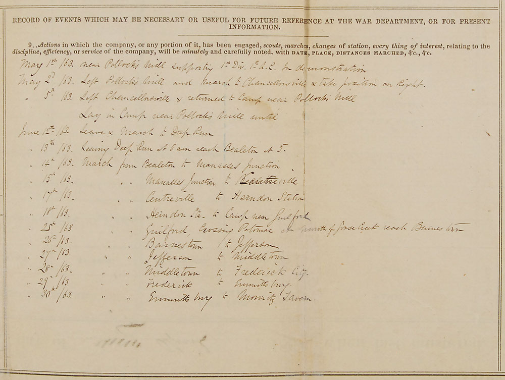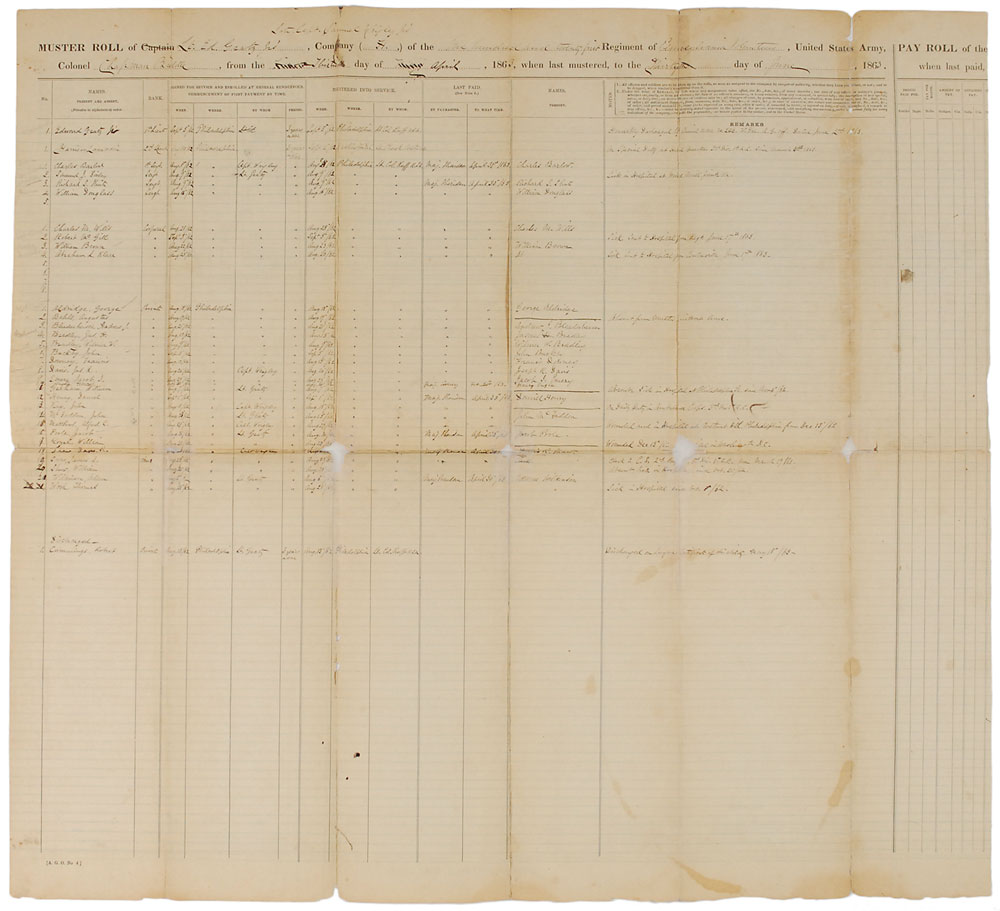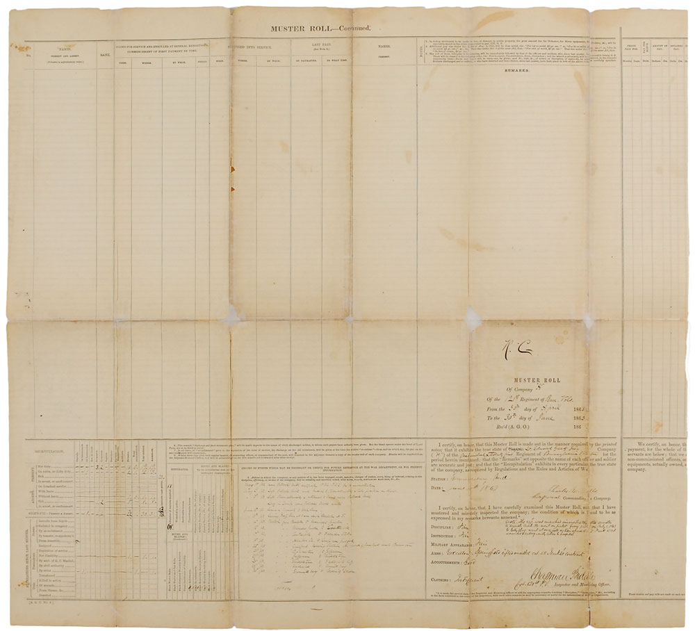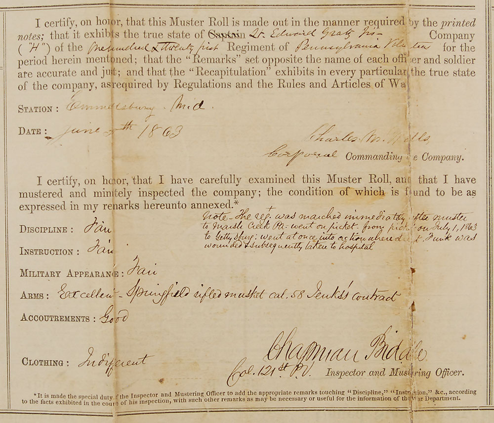 Civil War–dated manuscript muster roll, signed “Chapman Biddle, Col. 121st P. V.,” one page both sides, 23 x 21, June 30, 1863. A document for the 121st Regiment of Pennsylvania Volunteers covering the period from April 30 through June 30, 1863, listing a detailed record of the force’s movements throughout the time period, in part: “May 2d…Left Pollock’s Mill and march to Chancellorsville & take position on Right…June 30th…[March from] Emmittsburg to Monity Tavern.” A further note adds: “The regt was marched immediately after muster to Marsh Creek Pa. Went on picket on July 1, 1863 to Gettysburg; went at once into action where Lieut. Funk was wounded & subsequently taken to hospital.” The document also describes the unit’s arms as “Excellent—Springfield rifled musket cal. 58 Jenks’ contract.” The opposing side lists the names of the soldiers in the 121st Regiment, their service information, and additional remarks. Fragile intersecting folds with several tape-repaired full separations (one passing through Biddle’s signature), scattered stains, and small areas of paper loss, otherwise very good condition. Pre-certified PSA/DNA.