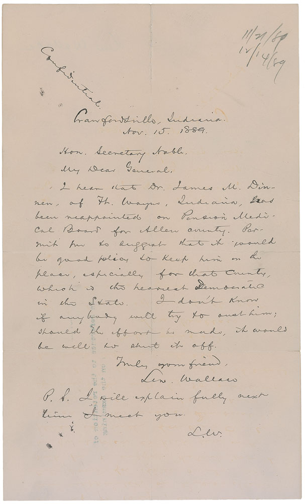 Union general (1827–1905) who became better known as the author of the best-selling novel Ben-Hur. ALS, one page, 6.5 x 11, November 15, 1889. Letter to Secretary of the Interior John Willock Noble. In full: “I hear that Dr. James M. Dinnen, of Ft. Wayne, Indiana, has been reappointed on Pension Medical Board for Allen county. Permit me to suggest that it would be good policy to keep him in the place, especially for that county, which is the heaviest Democratic in the State. I don't know if anybody will try to oust him; should the effort be made, it would be well to shut it off." Cryptically, Wallace adds in a postscript, "I will explain fully next time I meet you. L. W." In very good condition, with partial separations along intersecting folds and some ink transfer from a typed letter to lower portion. Pre-certified PSA/DNA.