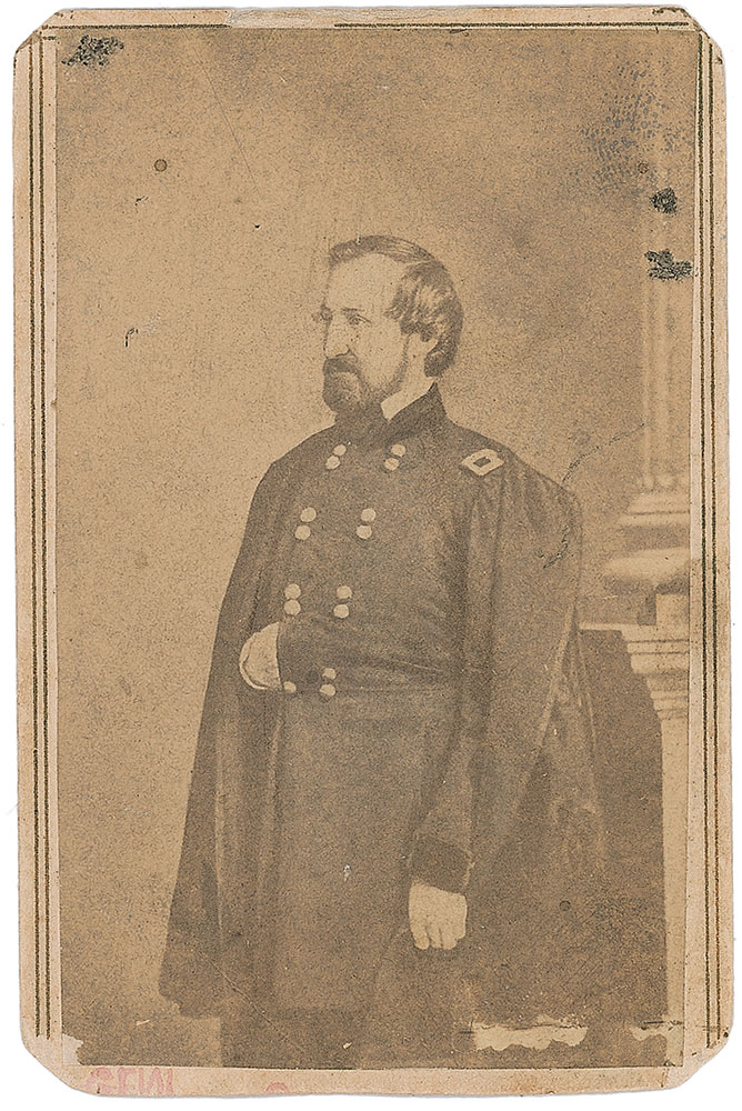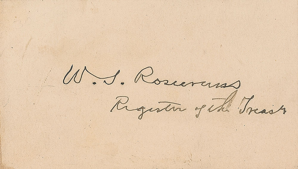 Union general (1819–1898) who, after a long string of victories, was defeated at Chickamauga and relieved of his command. Ink signature, “W. S. Rosecrans, Register of the Treasury,” on an off-white 3.5 x 2 card. In fine condition, with light soiling and a trivial brush to ink. Accompanied by an unsigned Brady carte-de-visite portrait of Rosecrans in uniform. Pre-certified PSA/DNA.